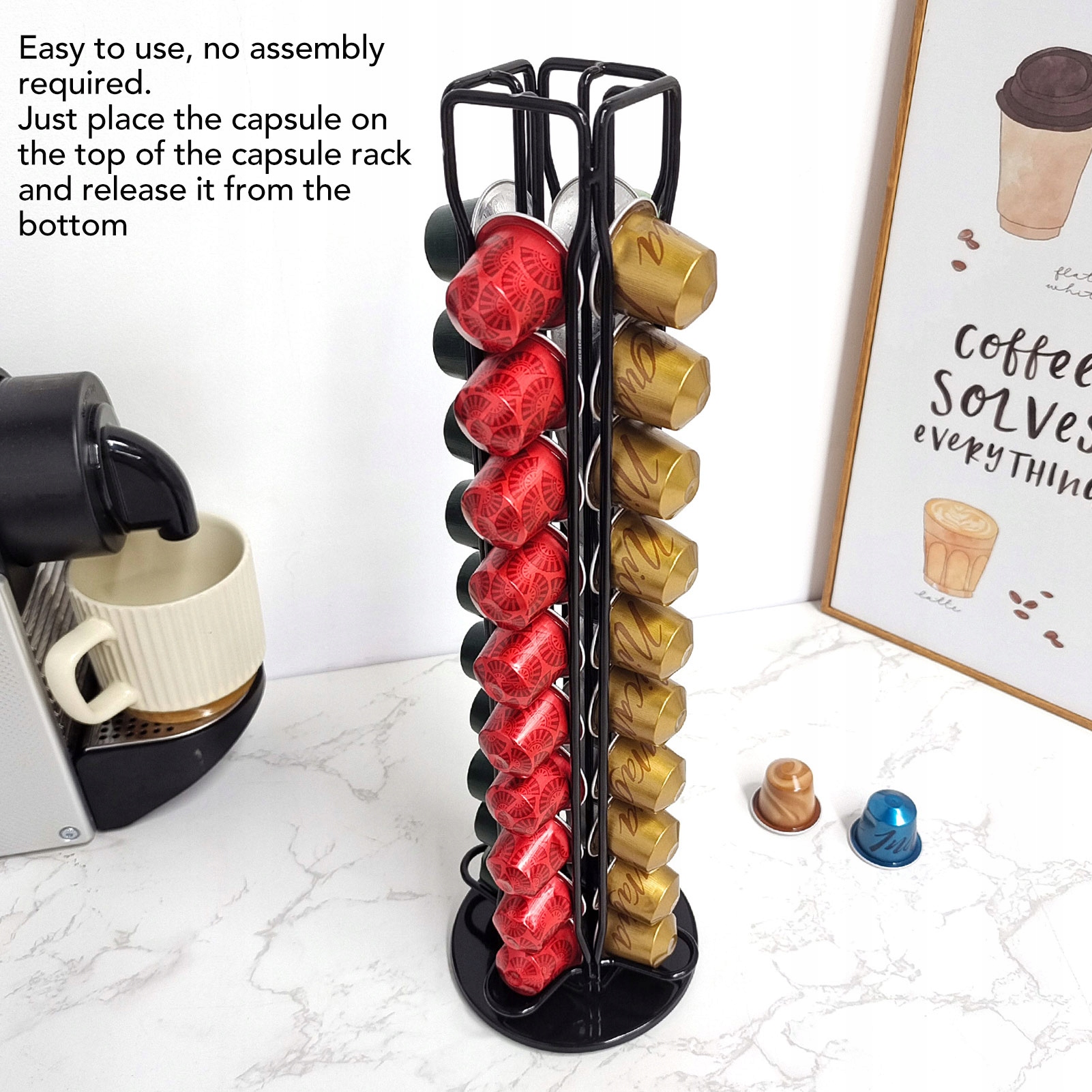 1. Держатель для 40 капсул: Карусельный держатель для кофейных капсул может вмещать 40 капсул одновременно, предоставляя вам дополнительное место на столешнице. Минималистичный дизайн с мощной функцией хранения, не занимает слишком много места. Применяется к кофейным капсулам Nespresso.