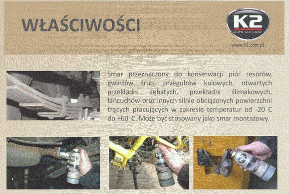 Графитовая смазка К2 предназначена для ухода за рессорными пластинами, винтовой резьбой, шаровыми шарнирами, открытыми шестернями, червячными передачами, цепями и другими сильно нагруженными трущимися поверхностями.