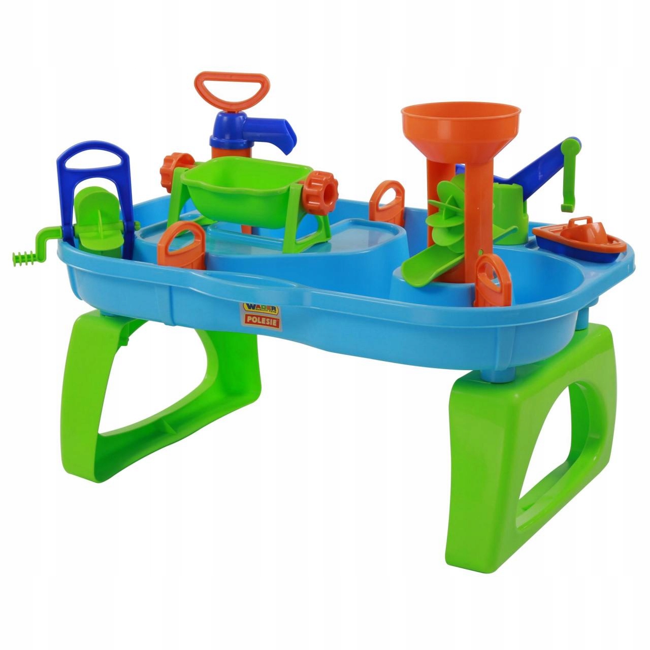 Набор ВОДНЫЙ МИР представляет собой корыто на двух широких ножках, в которое можно наливать воду. Внутри есть водные коридоры и многочисленные подвижные элементы. Оснащен двумя шлифовальными машинками. Один гонит воду, другой имеет воронку, через которую мы выливаем жидкость на вращающееся водяное колесо. Имеются три дамбы и кран с насосом, из которого вода поступает в емкость. Мы можем выливать из него воду благодаря двум ручкам, которые позволяют наклонять контейнер. Также имеется подъемник с крюком, к которому можно прикрепить лодку.