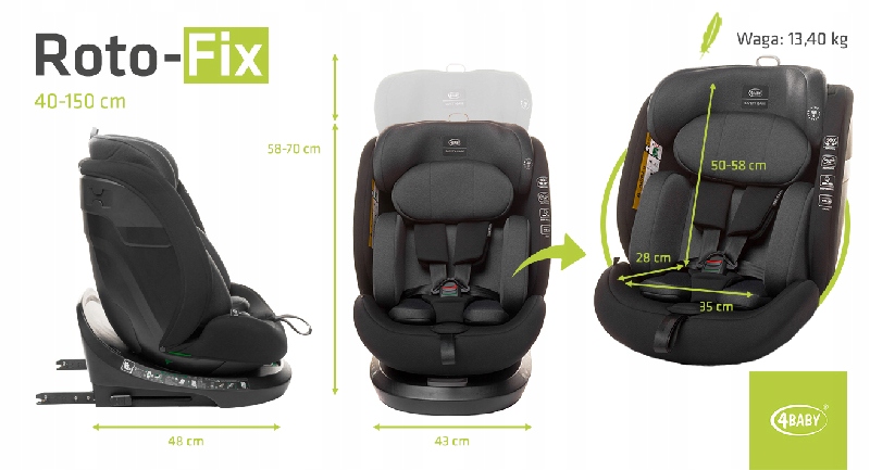 Сиденье Roto-fix i-Size представляет собой поворотное сиденье, изготовленное в соответствии с самым строгим допуском R129. Это гарантирует максимальную защиту ребенка ростом от 40 до 150 см. Roto-fix оснащен вращающимся на 360° основанием, оснащенным системой Isofix и ремнем Top Tether, что делает его установку и использование чрезвычайно простыми и быстрыми. Сиденье Roto-fix устанавливается против хода движения (RWF) до роста маленького пассажира 105 см (т.е. примерно 4 лет), а безопасную и комфортную поездку обеспечит 5-ступенчатая регулировка сиденья в диапазоне 132. -145°. Тем не менее, перемещение вперед возможно от 76 до 150 см с 5-ступенчатой регулировкой в диапазоне от 108 ° до 121 °. Сиденье растет вместе с ребенком, адаптируясь к его размеру и потребностям. а редукционные вставки удлиняют сиденье и гарантируют анатомически правильное положение. Для удобства чуть более крупных детей сиденье оснащено 15-точечной регулировкой подголовника, что позволяет оптимально подогнать его под рост ребенка. Сама конструкция достаточно широка, чтобы вместить более крупных детей, а все удобства созданы для того, чтобы путешествие на машине было не только безопасным, но и комфортным.