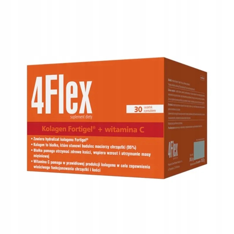 4FLEX Новое поколение коллаген + витамин С является легко впитываемого гидролизата коллагена Fortigel® в форме панкетов с порошком. Каждый пакетик содержит до 10 г уникального коллагенового гидролизата - Fortigel®. Уникальная гидронированная форма молекулы Fortigel® характеризуется оптимальным размером, что значительно облегчает поглощение. С возрастом уровень коллагена уменьшается, и его недостатки проявляются не только из -за потери эластичности кожи или прогрессирующей дегенерации суставного хряща, но также влияют на нашу жизненную силу, хорошо и комфорт жизни. Коллаген - это белок, который является строительным материалом для хряща (95%). Яркая ткань хряща, обнаруженная в биоактивной пищевой добавке 4FLEX. Они поддерживают поддержание здоровых костей, обеспечивают поддержку роста и поддержанию мышечной массы. Добавление витамина С помогает в правильном производстве коллагена, чтобы обеспечить правильное функционирование хряща. 4FLEX - это чистые белки, без добавления холестерина, глютен и жира!