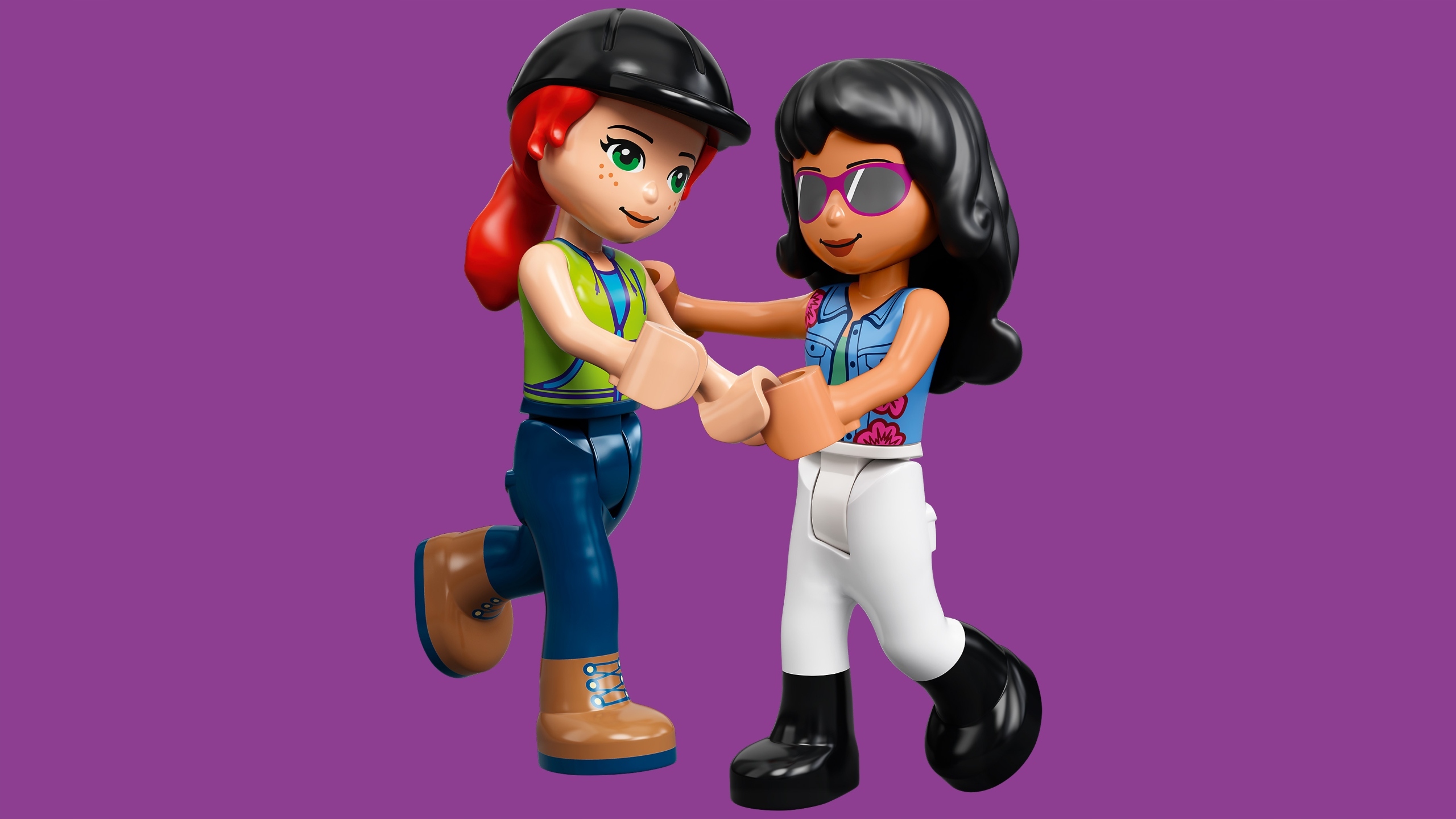 - В набор входят семь фигурок: мини-куколки LEGO® Friends Мии и Саванны, фигурка микрокуколки, а также фигурки собаки и пони. Есть также две игрушечные лошадки с реалистичными движущимися головами.