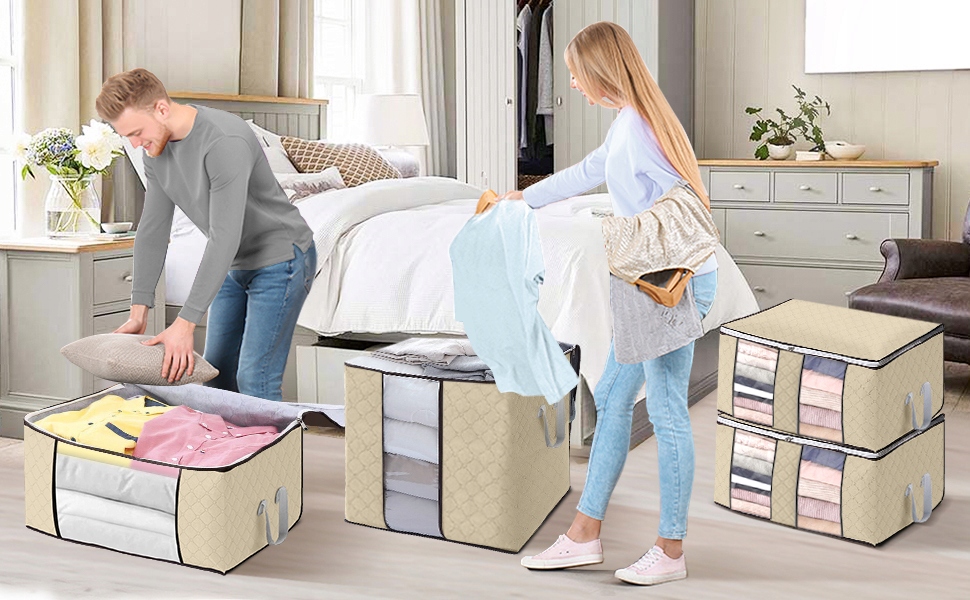 【УЛУЧШЕННЫЙ, ПРОЧНЫЙ МАТЕРИАЛ】 Наш органайзер для одежды изготовлен из высококачественного трехслойного композитного нетканого материала без запаха, который обеспечивает вентиляцию и защищает хранимые предметы. Мы предоставляем 4 упаковки больших беспыльных мешков для хранения одежды в одном наборе, поэтому лучше взять эти большие мешки домой для одежды, одеял, одеял и подушек для хранения постельного белья.