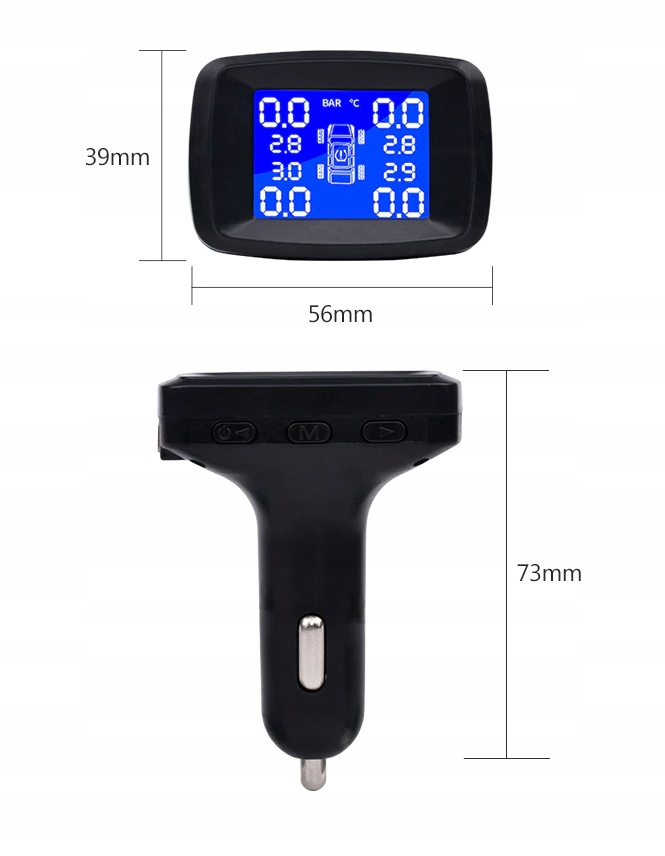 Набор датчиков TPMS обеспечит вашу безопасность на дороге. Он будетконтролировать давление и температуру в шинах. В течение 3 секунд после изменения давления комплект отправит информацию на цветной ЖК-приемник, подключенный к гнезду прикуривателя. Если изменения давления и температуры не резкие, датчики, установленные на клапанах, отправляют информацию раз в 3 минуты.