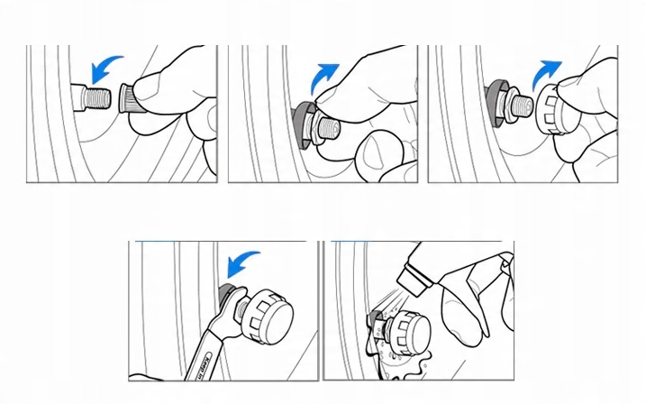 Установка датчиков из комплекта очень проста и быстра. Откручиваем старые колпачки клапанов. Затем накручиваем противоугонные гайки, а затем датчики согласно маркировке датчиков: LF (Left Front) левое переднее колесо, LR (Left Rear) заднее левое колесо, RF (Right Front) правое переднее колесо, RR (Right Rear) ) заднее правое колесо. Затягиваем вручную противокражную гайку как можно ближе к датчику, а затем затягиваем ее с помощью ключа, входящего в комплект.