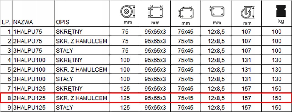 Комплект состоит из четырех колес, оснащенных монтажной пластиной с тормозом. В комплект входят четыре колеса, код 2HALPU125K2, в таблице под позицией 8.