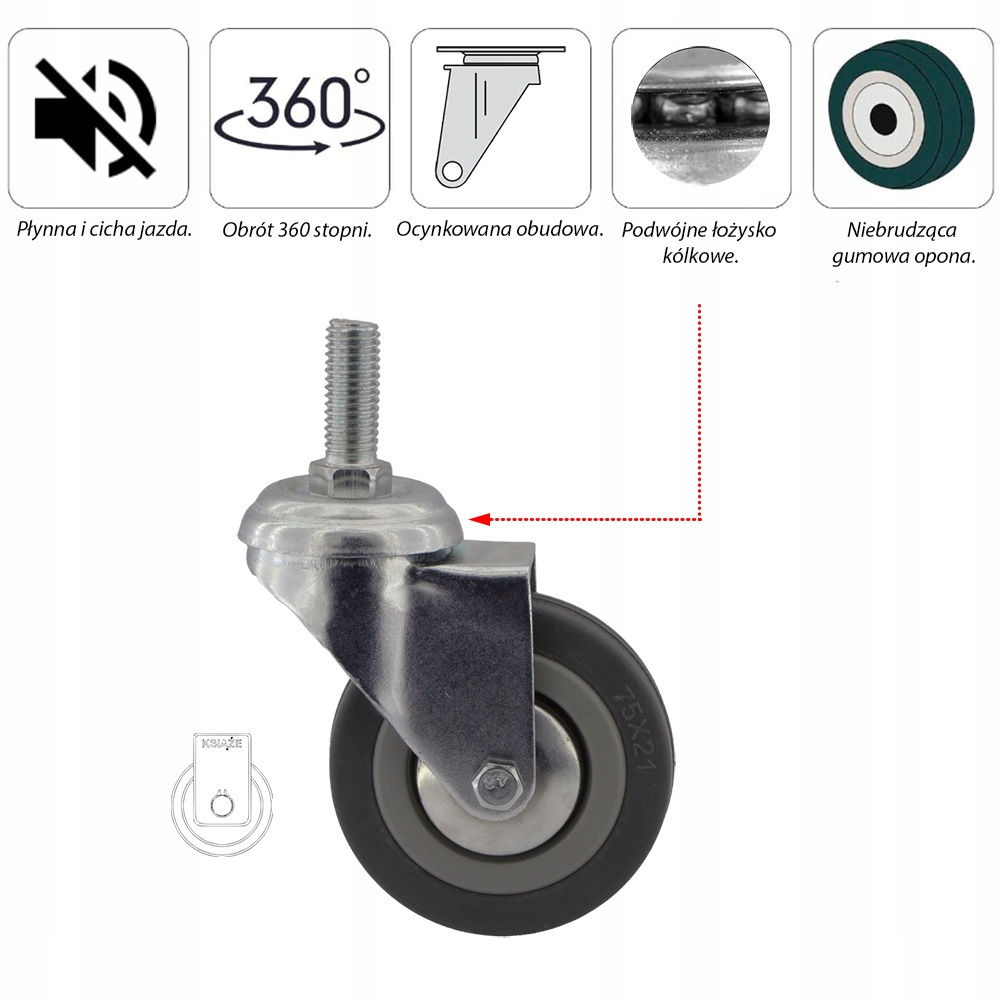 - КОЛЕСО состоит из полипропиленовой ступицы и немаркирующей резиновой шины, с подшипником скольжения. Колеса имеют прочность 70 кг на колесо. Они медленно изнашиваются, устойчивы к повреждениям, поглощают удары и вибрации. Они вращаются на 360 градусов, облегчая маневрирование мебели или коляски. Они плавно вращаются на твердых и гладких поверхностях, таких как бетон, с минимальным трением.
