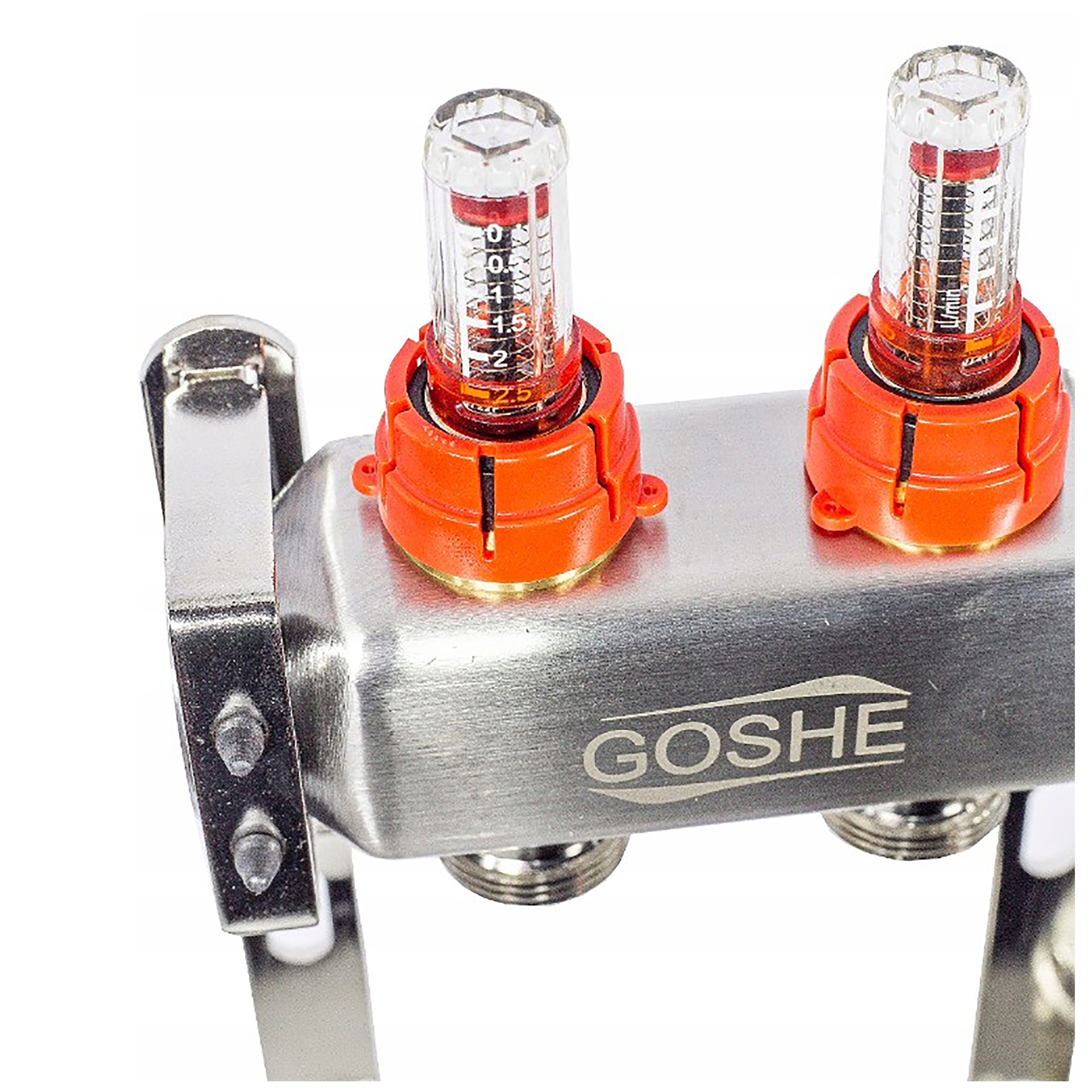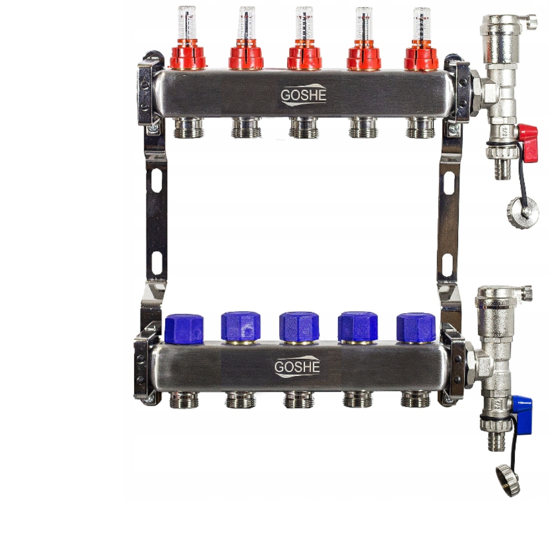 ⏩ Коллектор из нержавеющей стали ГОШЭ 0331.213 (5 контуров) - балки никелированные,ротаметры, В комплект входят термостатические вставки для приводов, автоматические и ручные воздухоотводчики, сливные клапаны.