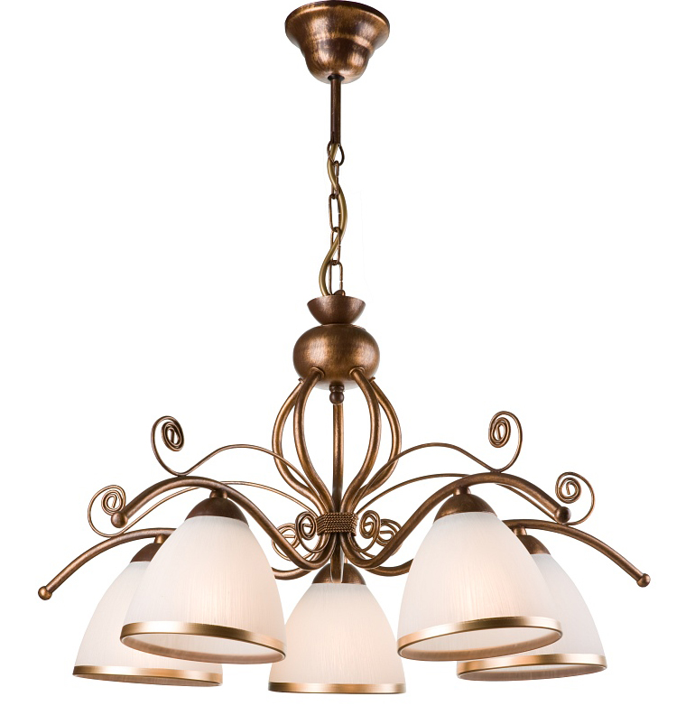 Классический потолочный светильник RETRO II 5-рожковый, подвесной на цепочке , изготовлен из коричнево-медной стали, крепится на крючок с возможностью укорочения цепочки.