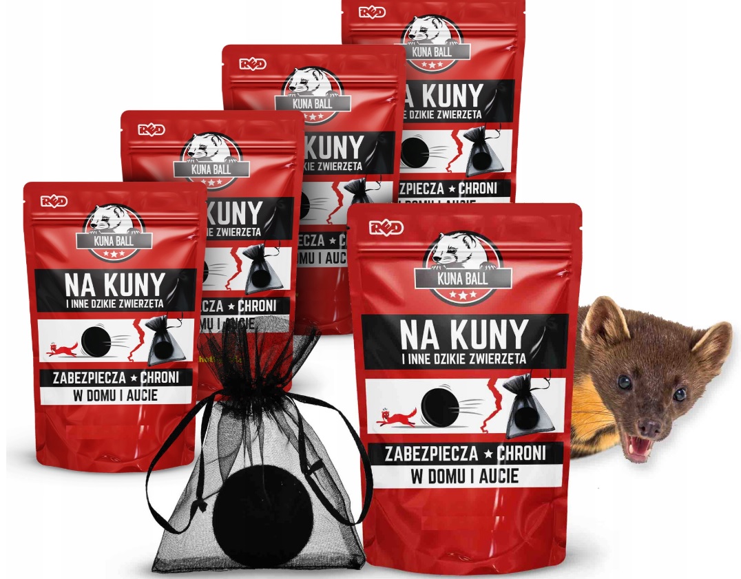 kuna ball бренд red - инновационный аромат для защиты от транспортных средств и пространства от мартенс и других диких животных. Продукт был разработан в виде сферического вклада, который является непревзойденной защитой для автомобилей, караванов, чердаков или чердаков. Сумка аромата на мартенсах содержит лабораторию разработанную ароматическую композицию, которая является результатом долгосрочных испытаний. Испытания неоднократно подтверждали необычайную эффективность в естественных условиях. Эффект подготовки состоит в том, что отговаривает боевые искусства в рамках вопроса о ароматах . Фракции ароматов были составлены таким образом, чтобы они были связаны с природными феромонами диких и враждебных животных (Fox, Dog, Cat, Eagle, Jastrząb), которые эффективно создают защитный щит и останавливает Мартен в области их действия