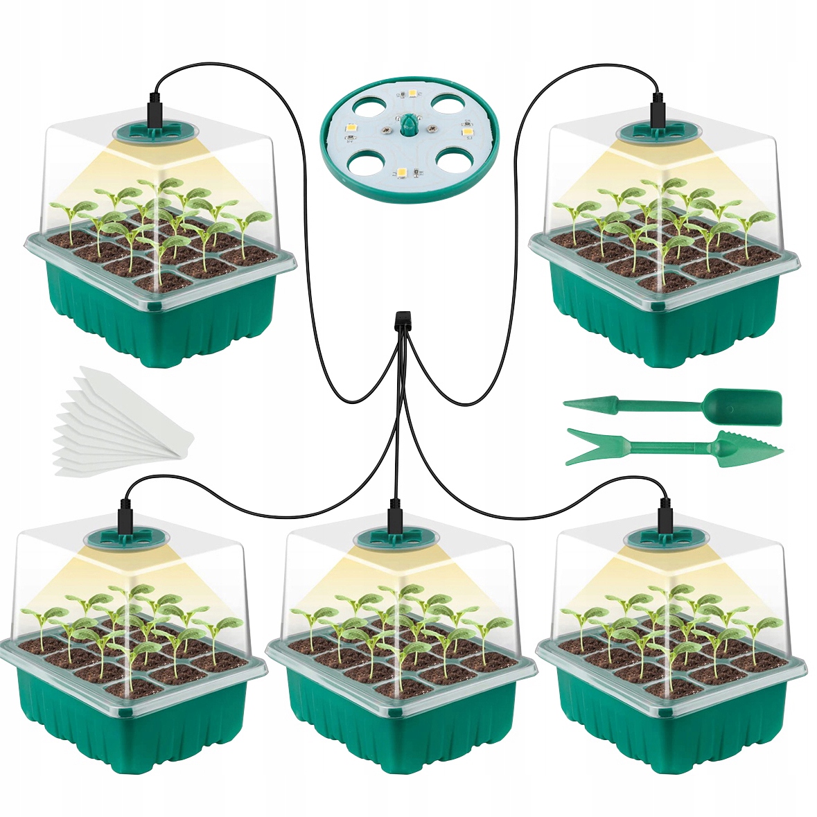 - 5* наборов коробок для проращивания семян (включая 12 вставок для ячеек, прозрачную крышку, нижний лоток),