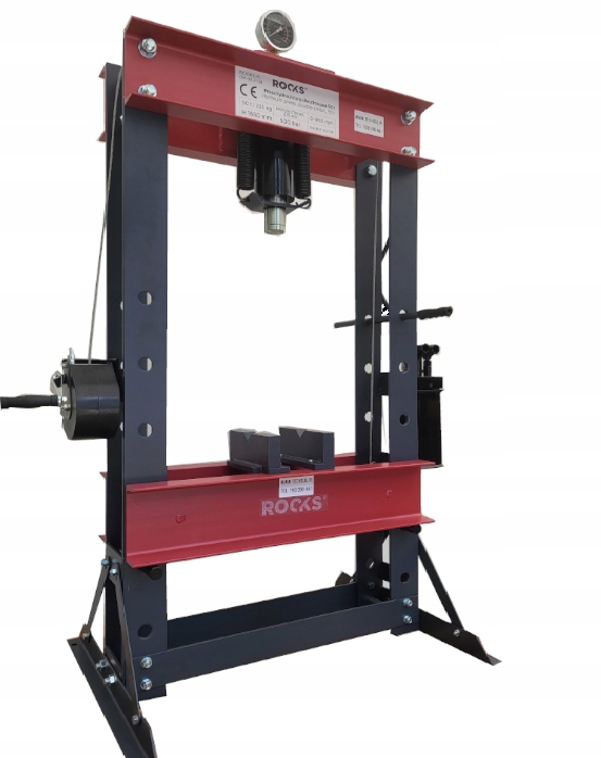 Пресс гидравлический стационарный 50Т имеет устойчивую рамную конструкцию с регулируемой по высоте средней балкой – столом для опоры прессуемых элементов. Пресс оснащен манометром и мощным и эффективным гидравлическим насосом с двумя поршнями для быстрой и точной работы. Ручной привод насоса. Пресс оснащен базовыми опорами для экструдированных элементов. Главный цилиндр стационарно установлен в центральном месте верхней балки.
