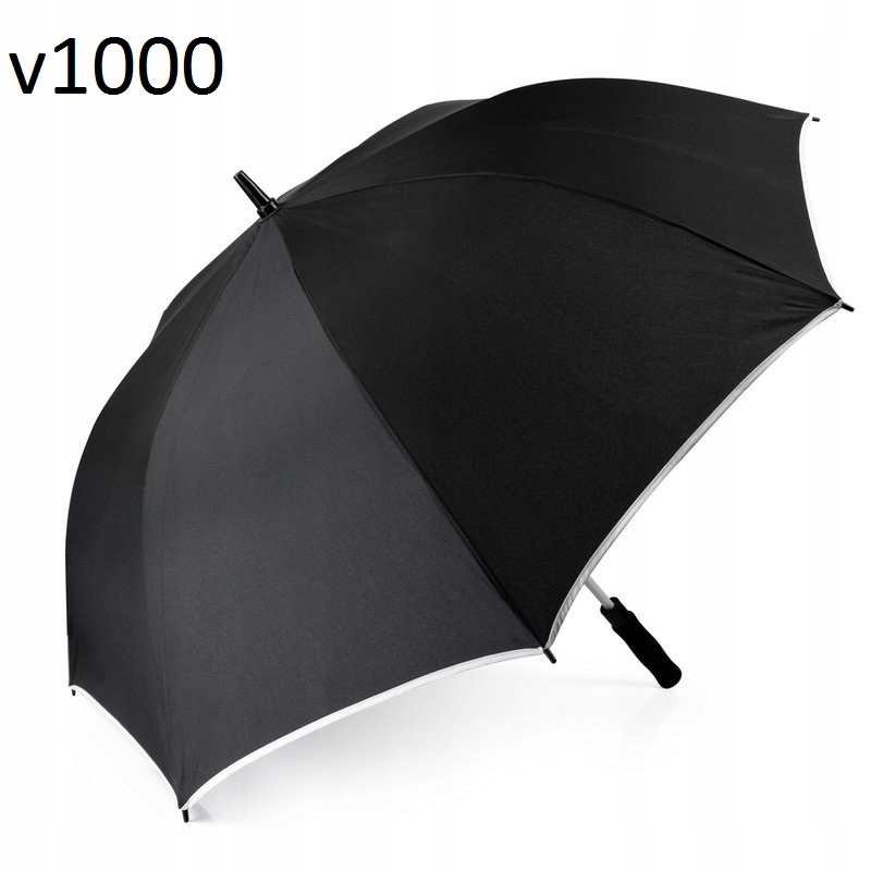 Автоматический зонт с белыми элементами, 8 панелей с белой окантовкой, ручка из пенопласта, белая кнопка, белый металлический каркас, белые ребра из стекловолокно, застежка-липучка.