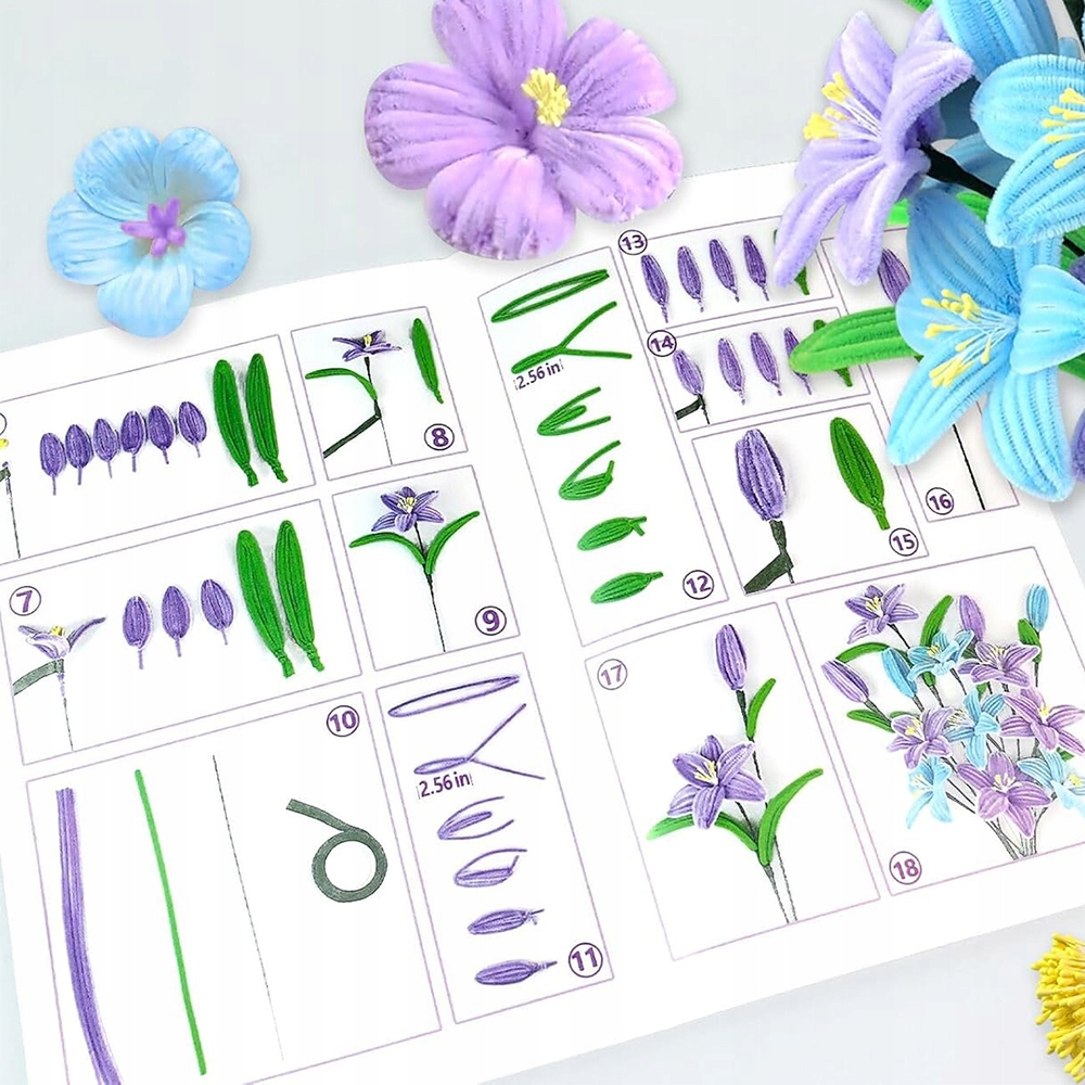 Включает в себя 100 палочек каждого из пяти основных цветов: светло-фиолетового/темно-фиолетового/фиолетового/синего/зеленого, а также 300 цветочных тычинок и вспомогательные материалы для удовлетворения ваших сложных творческих потребностей.