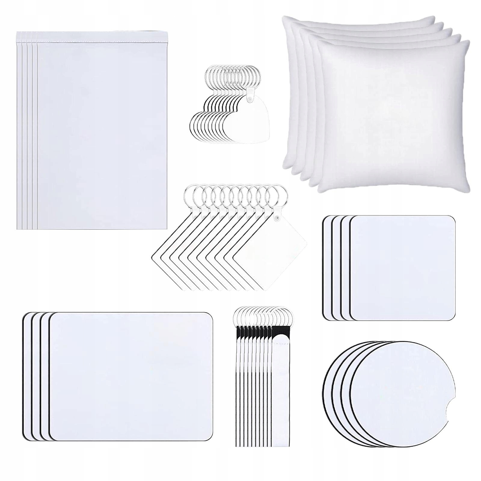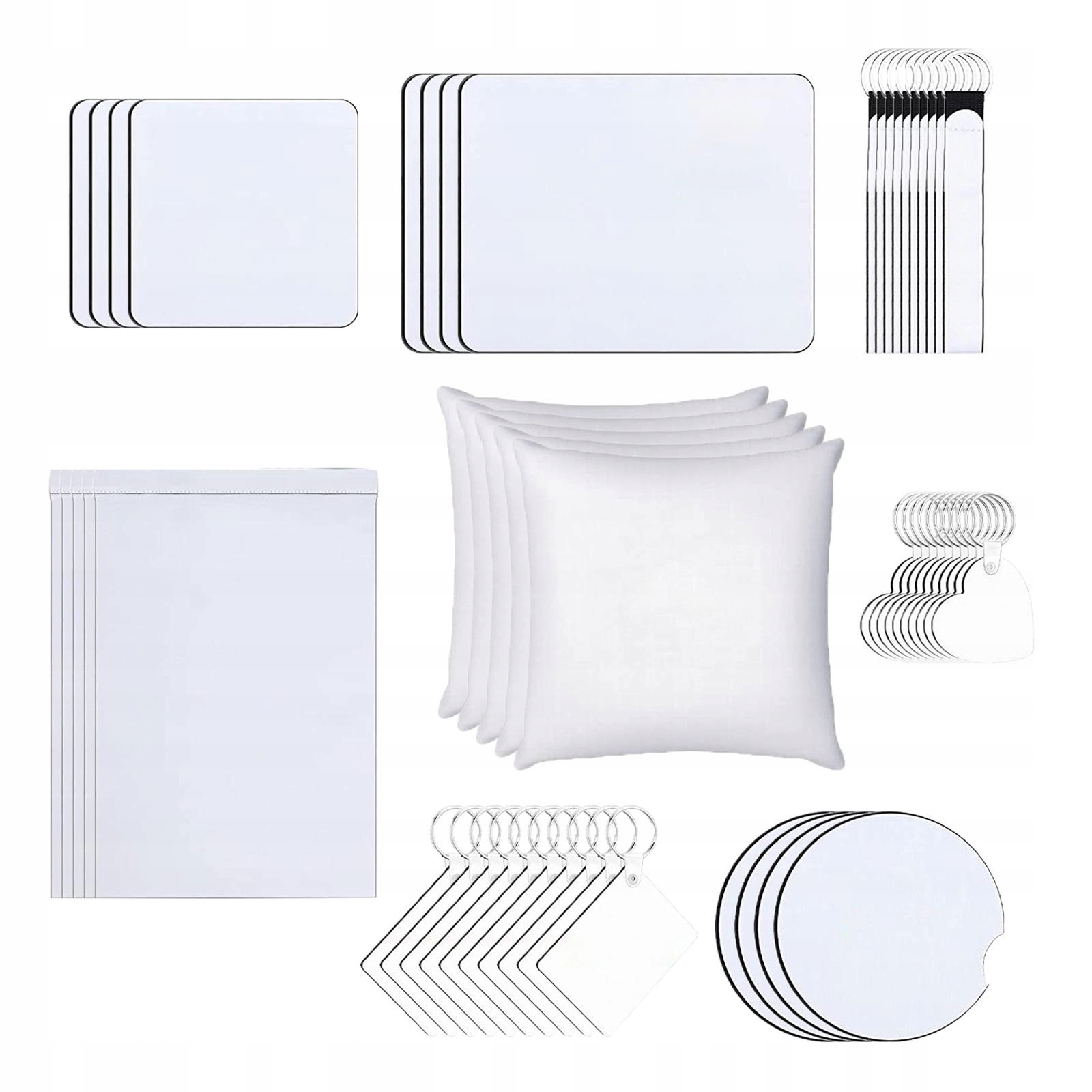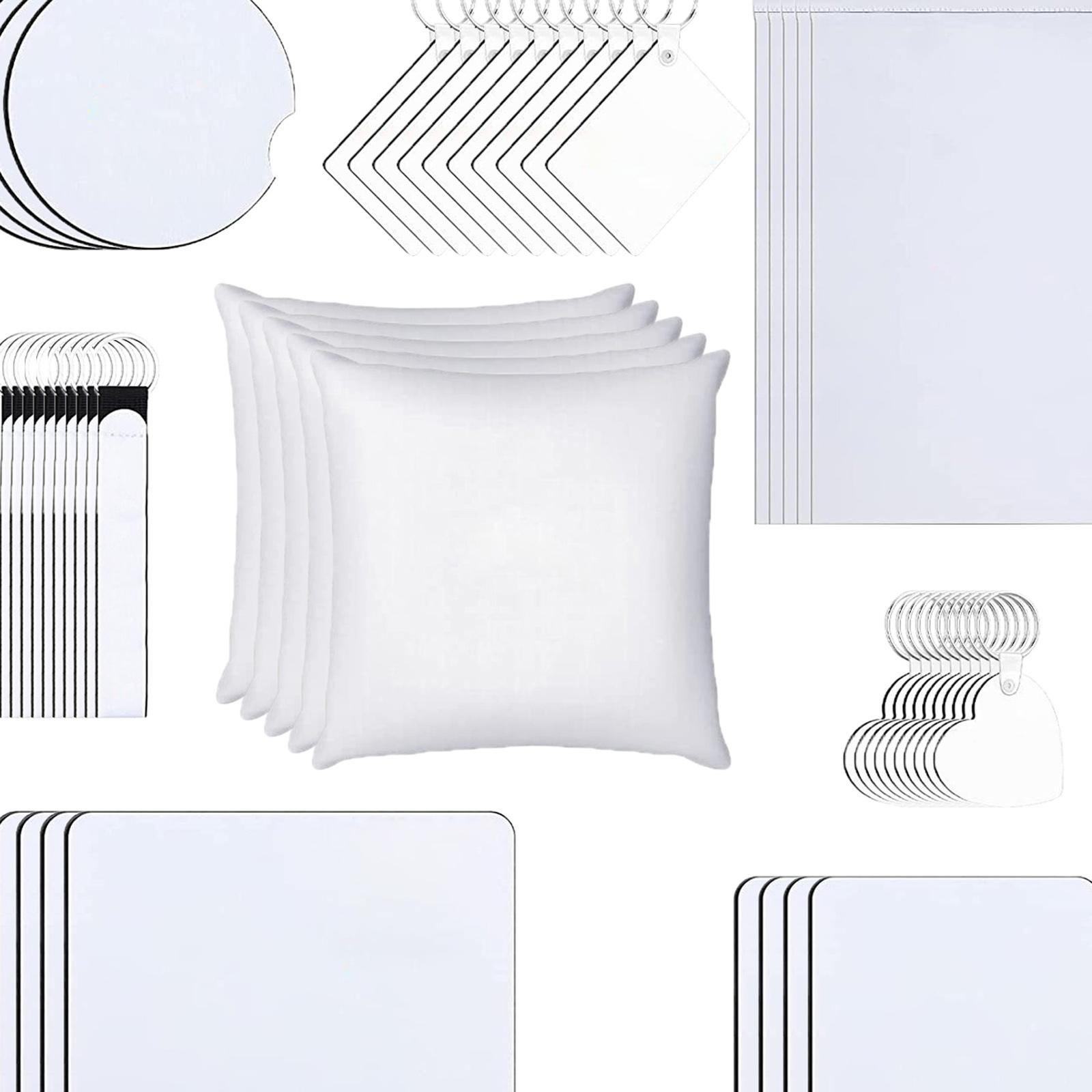 Содержимое упаковки: вы получите 5 наволочек, 4 квадратных подставки, 4 круглых подставки, 10 брелков в форме сердца, 10 прямоугольных брелков, 10 ремешков на запястье, 5 садовых флажков, 4 коврика для мыши. Достаточное количество может удовлетворить ваши потребности, чтобы сделать персонализированные поделки из сублимации.