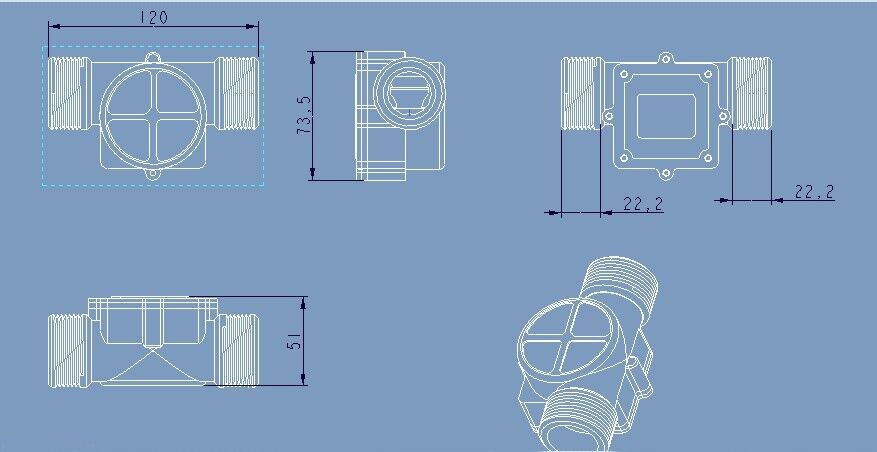 Например, при расходе 20 литров в минуту датчик генерирует прямоугольный сигнал с коэффициентом заполнения примерно 50 % и частотой 9 Гц (20*0,45) (+-10 %). Аналогично, для потока 50 литров в минуту это будет 22,5Гц (+-10%)