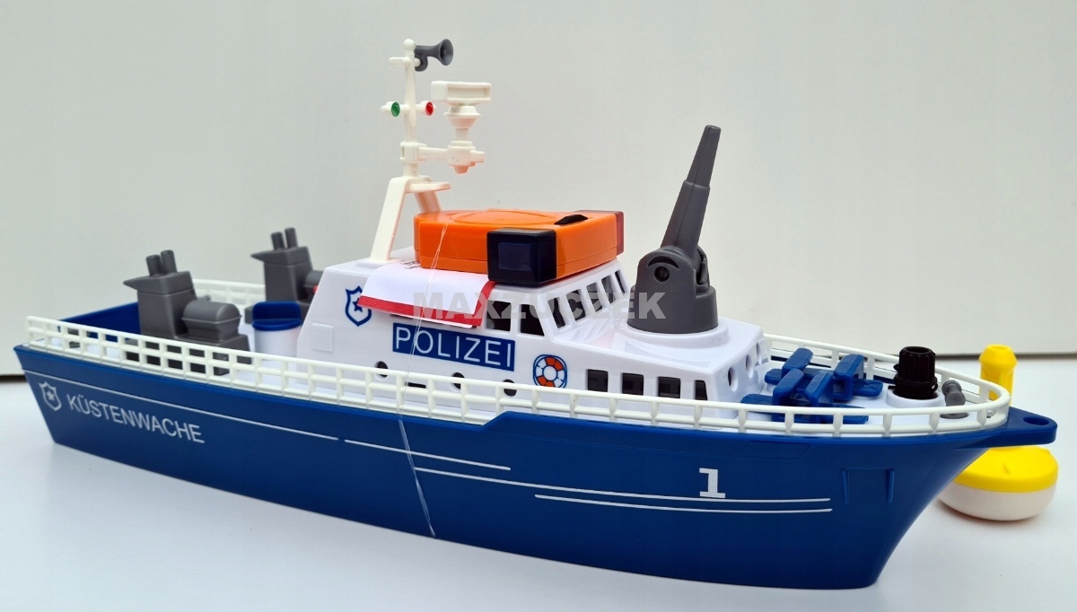Погоня контрабандистов по воде. Пена хлещет из-под лука. Полицейский катер на полной скорости мчится по воде, направляясь к быстроходному катеру. Полиция преследует контрабандистов, включив синие и красные мигающие светодиоды и электрический звуковой сигнал. Контрабандисты не останавливаются, они пытаются уйти из территориальных вод. Полиции оставалось только остановить лодку контрабандистов водометом: впереди вода! Для этого в пушку можно налить воду и с помощью колпачка создать давление. В катер попал водомет, полицейские на тросе подтягивают его к полицейскому катеру с помощью лебедки. На корме разворачивают люк и лодку поднимают на борт. Задача выполнена: контрабандисты пойманы. Новый полицейский катер SIKUWORLD может плавать и приводится в действие через адаптер с использованием стандартных моторов других системных игрушек. Большой буй доступен в качестве аксессуара и используется, когда лодка пришвартована.