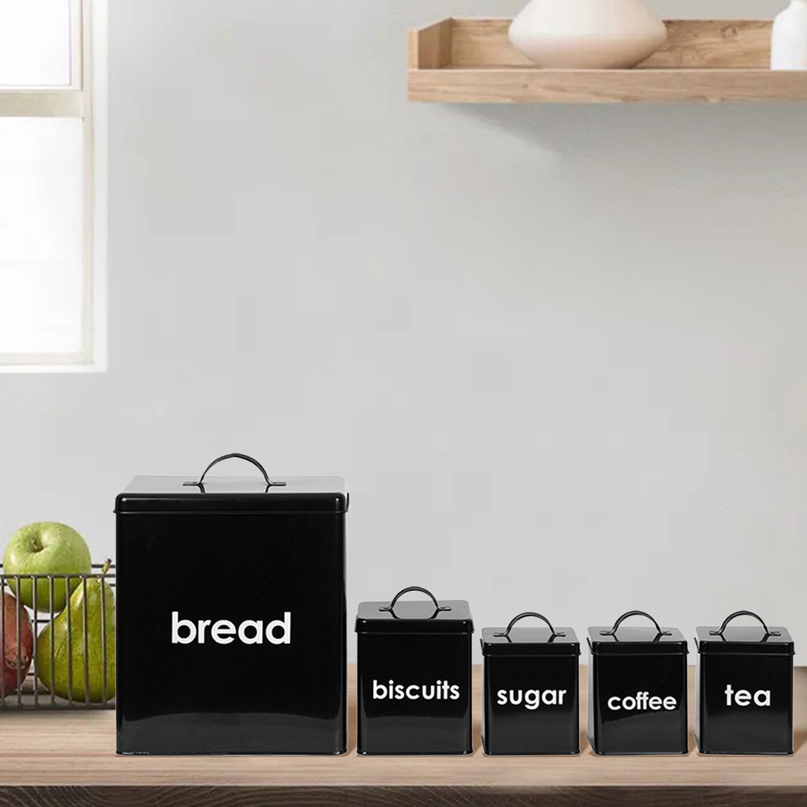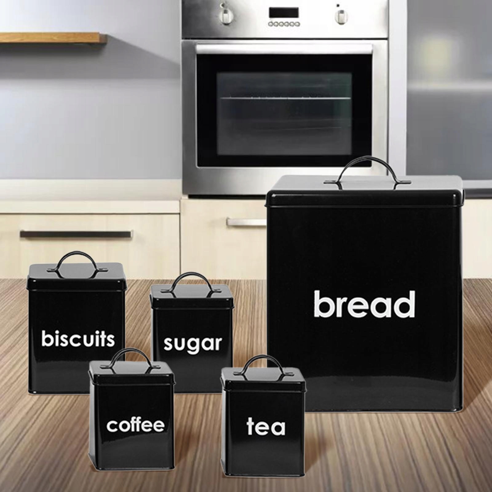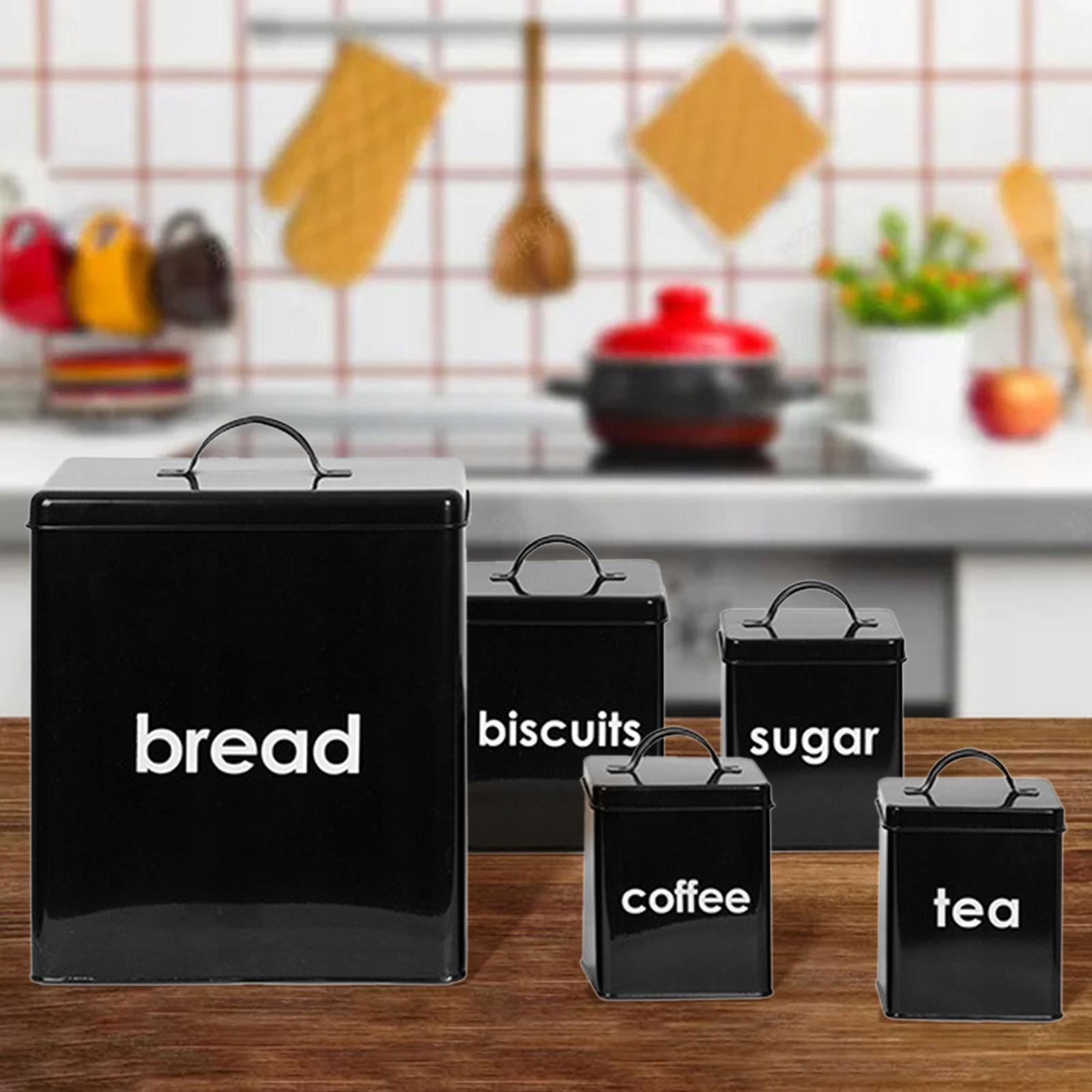Сохраняйте свежесть и вкусный хлеб: крышка сильно помещается на коробку, чтобы запечатать правильное количество, сохранить свежесть внутри и сохранить свежую выпечку. . Белая надпись для хранения кофе, чая, печенья и сахарных мешков напечатана на поверхности. Этот набор может осторожно упаковать вашу любимую еду.