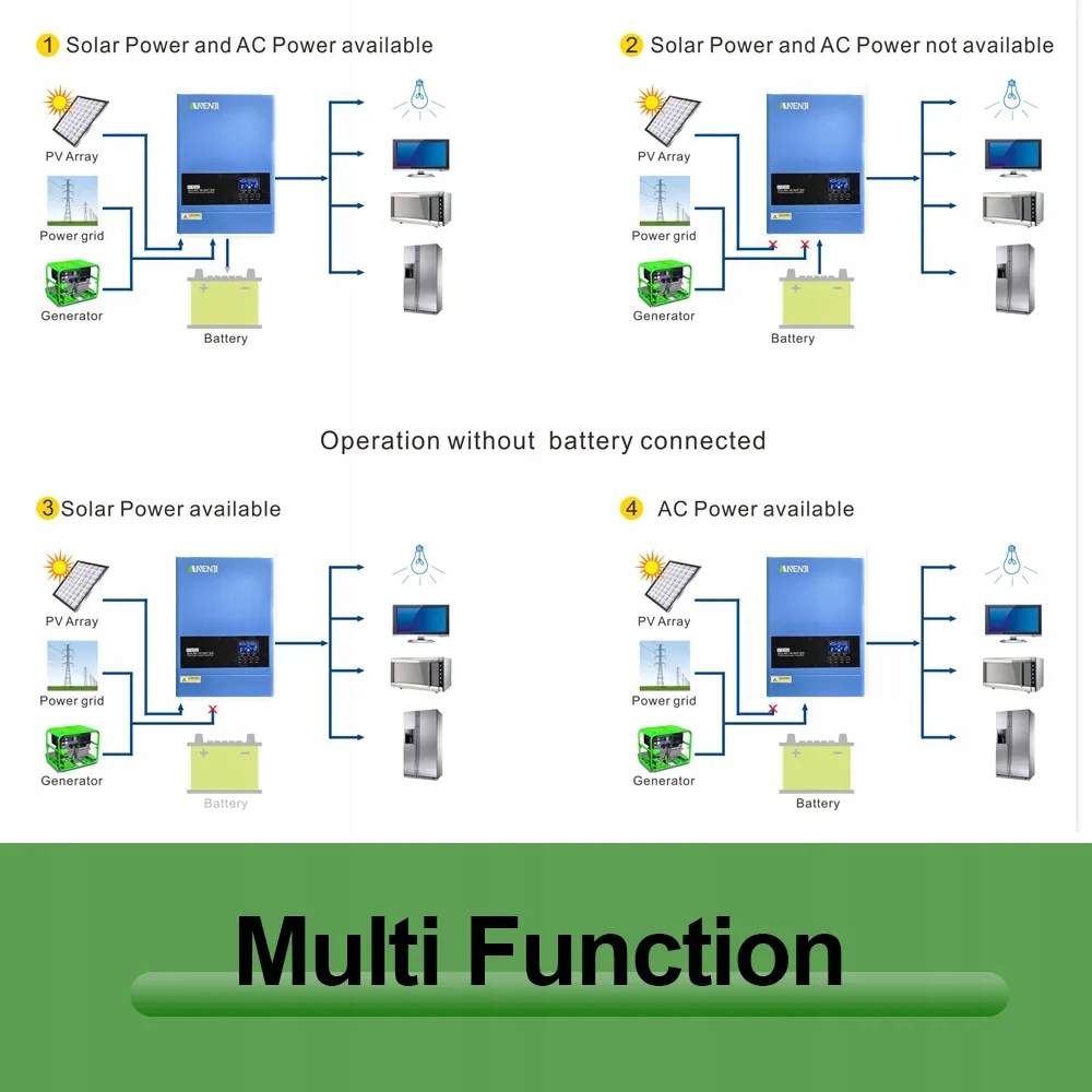 Инвертор может быть оснащен системой связи/управления через Wi-Fi и BMS для батарей. Это усиленная расширенная версия очень популярного инвертора мощностью 5000 Вт. Фотоэлектрические системы низкого напряжения. Работа на острове, без отправки электроэнергии в сеть.