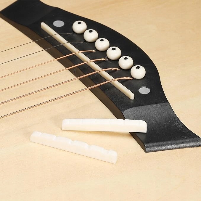 - Седло для гитары Bone имеет предварительно вырезанные отверстия для струн, которые требуют небольшого опыта сборки и очень просты и удобны в использовании.
