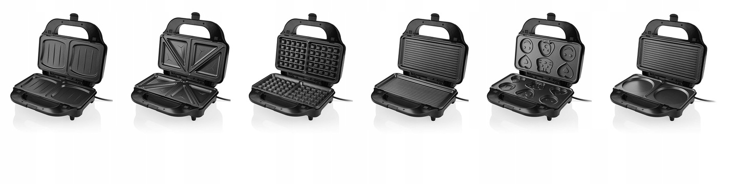 - Тостер 6 в 1 (тосты: треугольники и квадраты), вафельница, гриль/панини, американские блины, печенье детское)