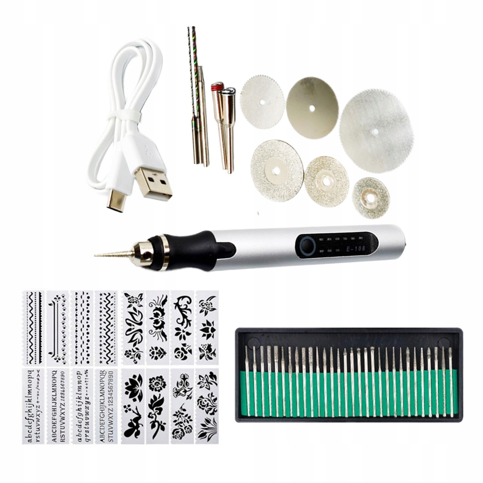 Набор независимых шлифовальных машин: содержит 1x гравировку ручки, 1x кабель передачи данных, 30x шлифование, 16x, 16 -кратные шаблоны шлифования, 6x режущих элементов, 2 -кратное шлифование, 2x подключение, 2x.