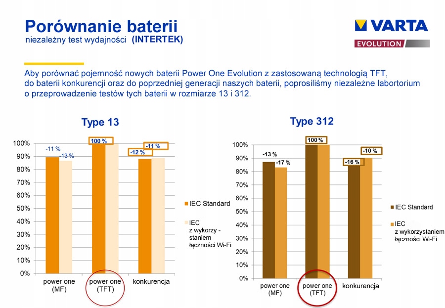 Чтобы подтвердить более высокую емкость аккумулятора Power One Evolution, компания Varta заказала испытания в независимой лаборатории Itertek. График, подготовленный лабораторией Intertek, показывает, что новые аккумуляторы мощнее аккумуляторов Power One предыдущего поколения и аккумуляторов конкурентов на 11–16%. Результаты касаются двух самых популярных типов слуховых батарей на рынке, а именно батарей типа 13 и батарей типа 312.