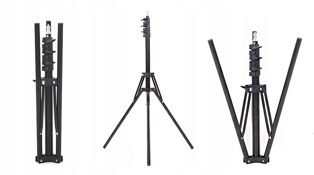 В комплект поставки светильника входит легкий, универсальный, плавно регулируемый, трехсекционный, устойчивый штатив с максимальной высотой 190 см. В сложенном виде его можно использовать для освещения небольших объектов вблизи (минимальная высота 49 см). Имеет удобные зажимы секций и универсальную монтажную головку 1/4 дюйма. Телескопический механизм складывания обеспечивает небольшие габариты в сложенном состоянии. Помимо кольцевых ламп, штатив можно использовать и для другого небольшого освещения (грузоподъемностью до 1 кг), например постоянного света, вспышки, софтбоксов, галогенных ламп.