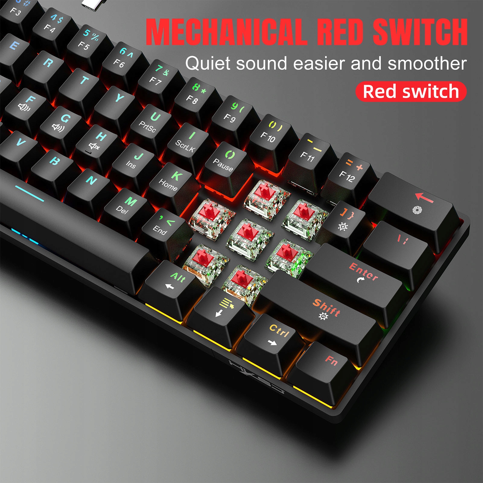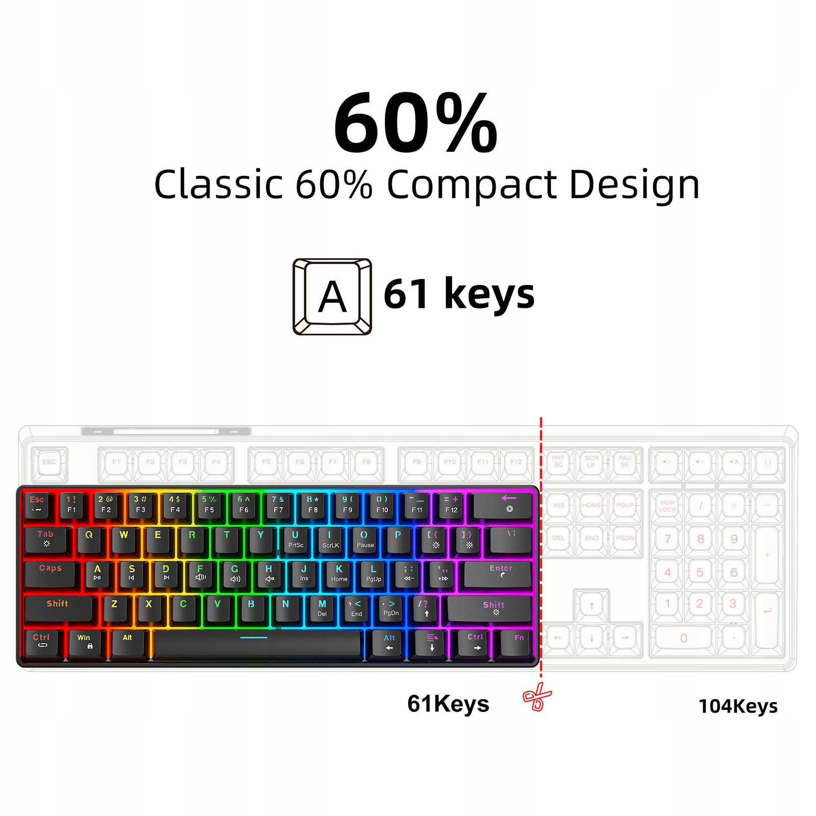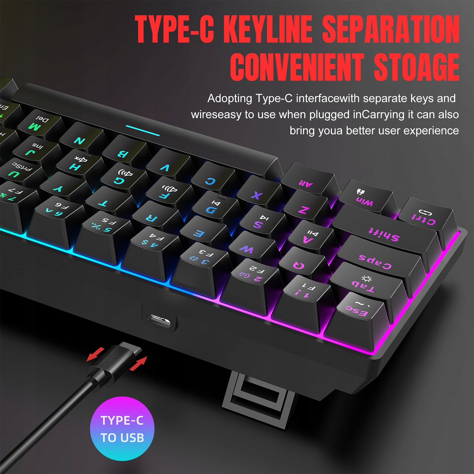 1. Портативный дизайн: проводная механическая клавиатура с 61 клавишей, компактной раскладкой, съемными клавишами и кабелем для удобства переноски и хранения, идеально подходит для работы в дороге.