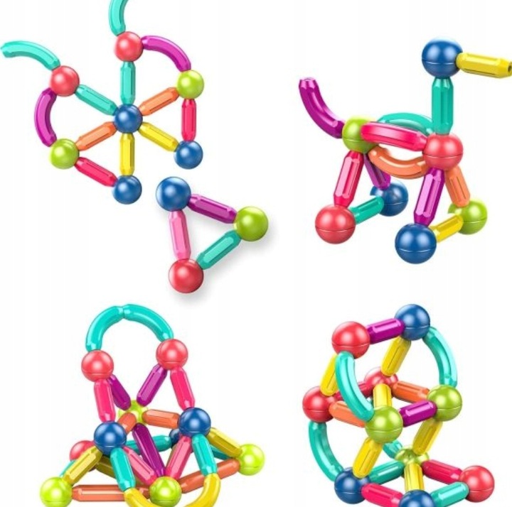 ⭐Есть 64 блока, 18 шариков, 22 маленьких цилиндрических блока, 16 больших цилиндрических блоков и 8 изогнутых блоков, которые можно собрать в 2D или 3D-модели различной формы для магнитных игр.