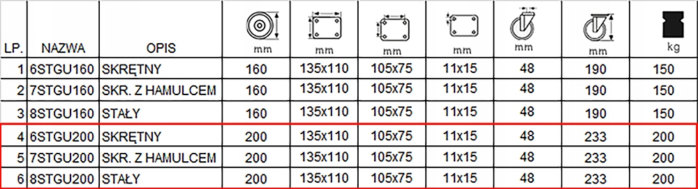 В комплект входят четыре колеса, закрепленные на штифте. Одно колесо с тормозом, код 7СТГУ200/26х500, в таблице под п.5, одно колесо без тормоза, код 6СТГУ200/26х500, в таблице под п.4, и два неподвижных колеса с кодом 8СТГУ200/26х500, в таблице под п.6.