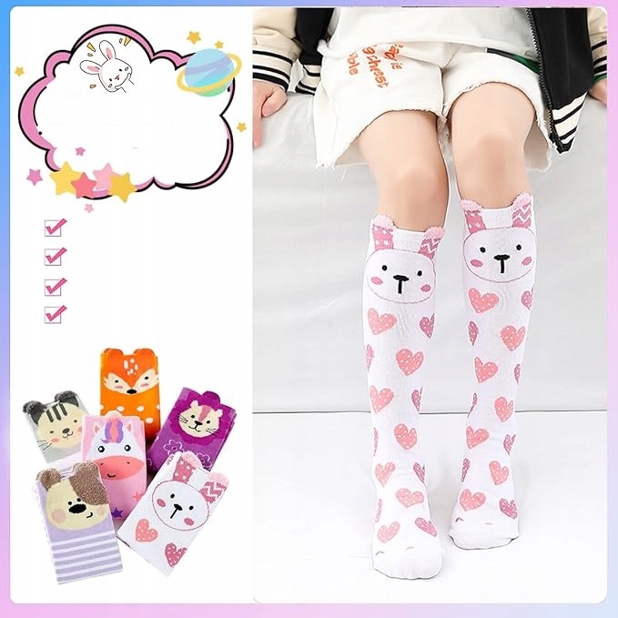 освещают детские дни смешными и красочными носками! Этот набор из 6 длинных носков с мотивами животных - идеальная идея подарка для девушки. Прекрасные узоры, удобные и приятные материалы делают их любимым дополнением каждый день и в особых случаях.