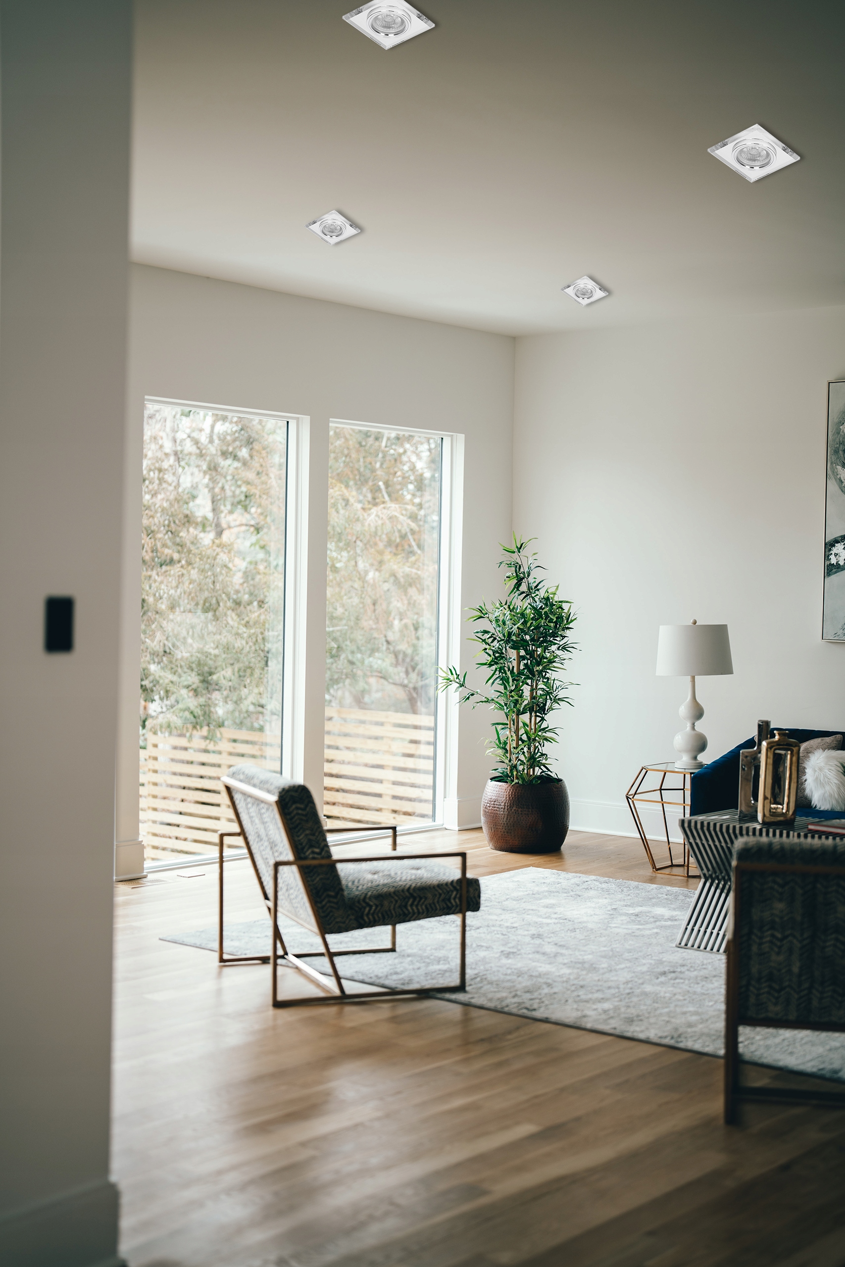 Набор из 6 потолочных галогенных светильников и лампочек теплого света мощностью 5 Вт.