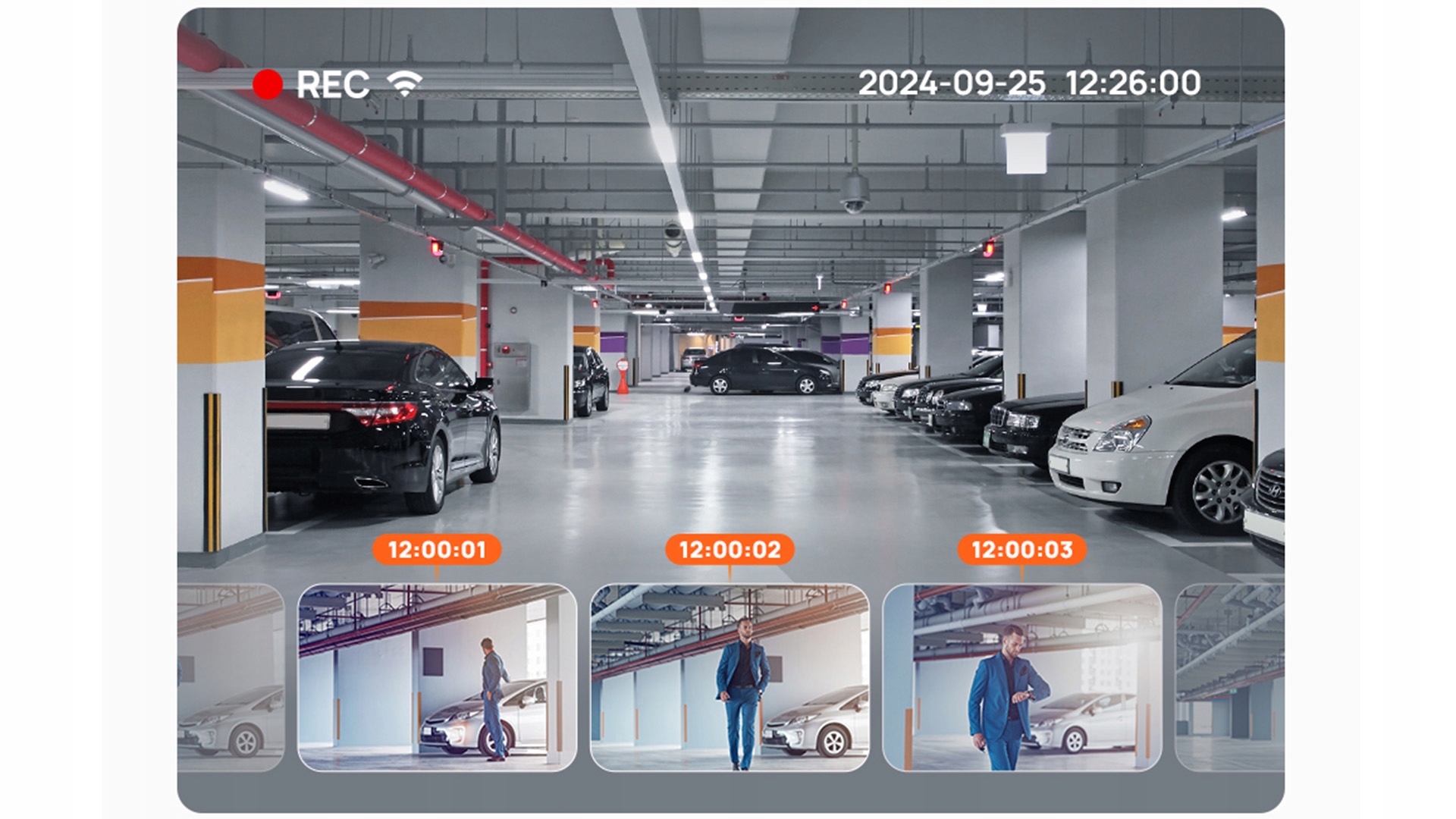 Запись с замедленной съемкой позволяет осуществлять непрерывную запись со скоростью 1 кадр/с в режиме парковки. Камера сжимает каждые 30 минут записи до 1 минуты для экономии места на карте памяти. Более быстрое воспроизведение позволяет сразу запечатлеть важные события.