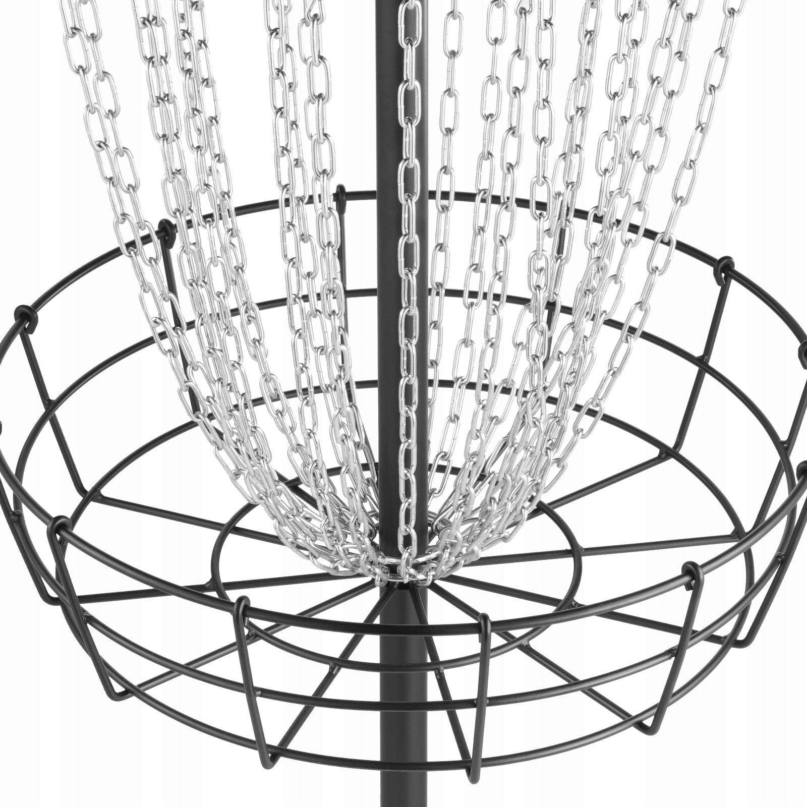 Двухслойная конструкция цепи: портативная корзина для диск-гольфа состоит из 12 внутренних и внешних слоев оцинкованной цепи толщиной 4 мм, которая действует как прочная броня, защищающая диск от повреждений. Будь то полет на высокой скорости или сильное столкновение, диск останется неповрежденным!