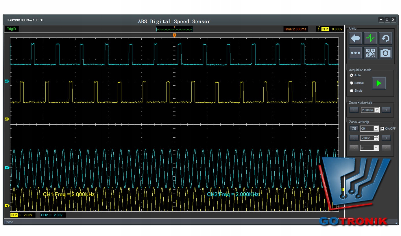 Осциллографы Hantek1008 могут иметь не очень высокие параметры по сравнению со стационарными осциллографами. Однако для конкретных измерений может потребоваться наличие восьми входных каналов. Осциллограф Hantek 1008 может успешно использоваться при осциллографических измерениях в автомобильной промышленности благодаря тому, что все исполнительные системы, сигналы от датчиков, положение валов имеют формы сигналов с частотами в диапазоне нескольких кГц, которые мы легко можем увидеть. Даже при диагностике цифровой CAN-шины частота не будет превышать 1МГц (диагностика цифровой CAN-линии в автомобиле в самом простом и распространенном случае предполагает проверку, есть передача или нет - виден ли кадр электрического сигнала) . Очень привлекательная цена и функциональность осциллографа Hantek1008 также побуждают начинающих электронщиков и любителей рассмотреть возможность приобретения этой модели. В аналоговых электронных системах, создаваемых и тестируемых инженерами-электронщиками, системах промышленной автоматизации и т. д., мы чаще всего наблюдаем формы сигналов в диапазоне нескольких Герц, которые легко визуализировать с помощью USB-осциллографа Hantek1008. Мы можем сохранять и архивировать сигналы в виде графических файлов BMP/JPG или сохранять данные измерений для дальнейшей обработки в электронных таблицах в формате *.txt, *.csv, *.xls, *.doc, *.rfc.