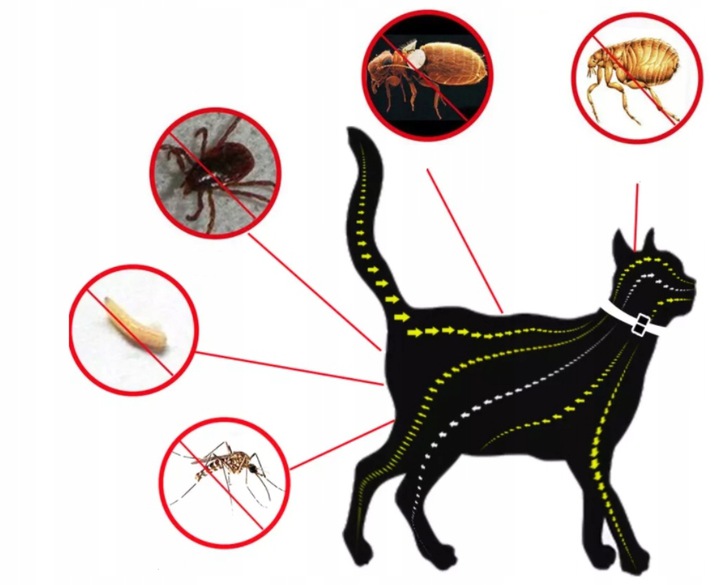 Ошейник полностью регулируется и может быть адаптирован под размер нашей кошки, собаки. Надеваем его на шею и тем самым поддерживаем профилактику от клещей, вшей, личинок, блох, комаров и других паразитов.
