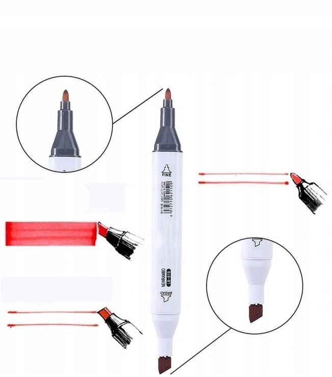 Маркеры оснащены двумя наконечниками - толщиной (3-6 мм). ) наклонно-скошенные и тонкие (1-2мм).Первый можно использовать для окраски больших поверхностей, а второй пригодится для деталей.