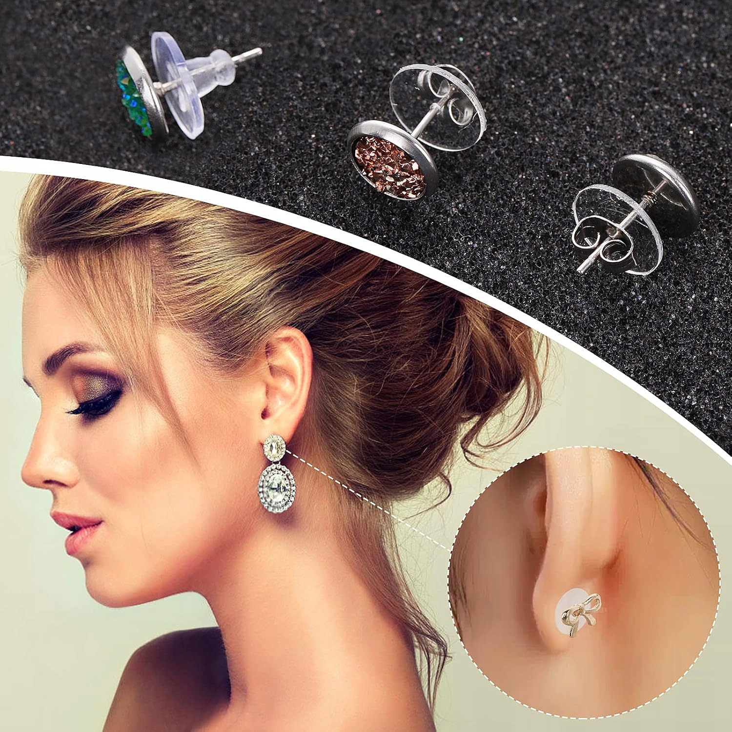 способ использования : Поместите силиконовые кольца, чтобы протестировать между внутренней частью серьги и задней частью ювелирных украшений