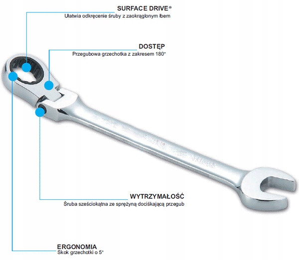 Прочный реечный механизм из закаленной стали, обеспечивающий небольшой ход клавиши, всего 5°. Обычный ключ требует хода на 30°, или в 6 раз больше площади поверхности. Рожковый ключ может с успехом заменить профессиональную быстроразъемную трещотку, и при этом имеет гораздо меньшие габариты - что позволяет получить доступ к труднодоступным местам.