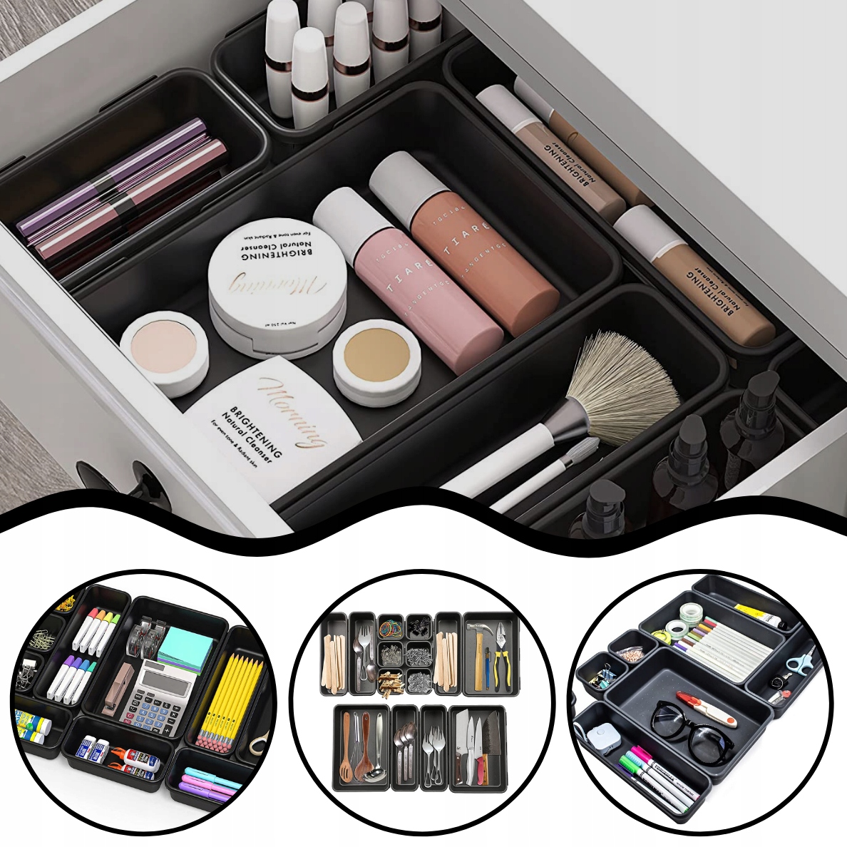 Независимо от того, находитесь ли вы на кухне, в ванной или в офисе, наши органайзеры помогут вам оставаться организованными и изолированными. Наш органайзер идеально подойдет для разных мест вашего дома. На кухне их можно использовать для хранения столовых приборов и мелких аксессуаров, обеспечивая порядок в ящиках. В ванной органайзеры помогут рассортировать самые необходимые предметы, например, косметику или туалетные принадлежности, что облегчит ежедневный уход. На столе органайзеры идеально подойдут для размещения офисных принадлежностей, таких как ручки, скрепки или заметки, что сделает ваше рабочее место аккуратным и упорядоченным.