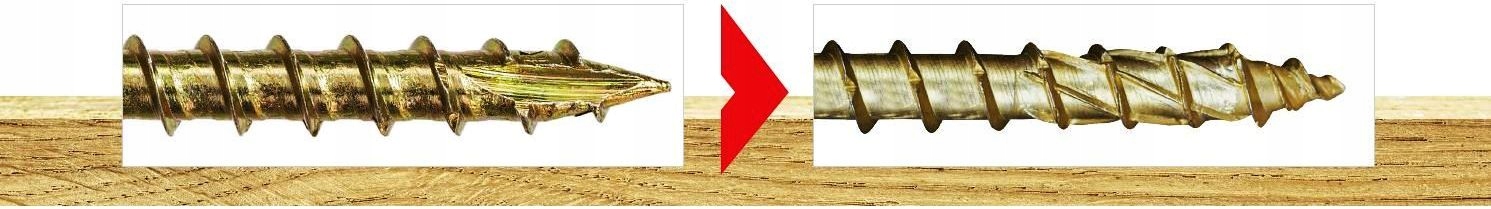 Дополнительные повороты на острие позволяют быстрее «подхватить» древесину на первом этапе завинчивания. Это преимущество особенно важно в случае соединений, в которых затяжка винта затруднена. Двойная нить позволяет нам добиться того же эффекта с гораздо меньшим давлением.