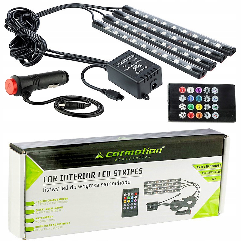 9 LED СТРІЖОК 12В ДЛЯ ОСВІТЛЕННЯ САЛОНУ АВТОМОБІЛЯ 4 ШТ RGB СМУЖКИ + ПУЛЬТ