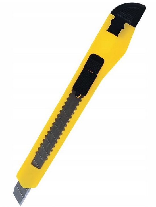 Имеют ручка пластиковая и благодаря своим размерам отлично подходит для резки бумаги, лезвие выдвижное, ломающееся - 12 деталей, фиксатор лезвия, замена лезвия путем снятия кончика,