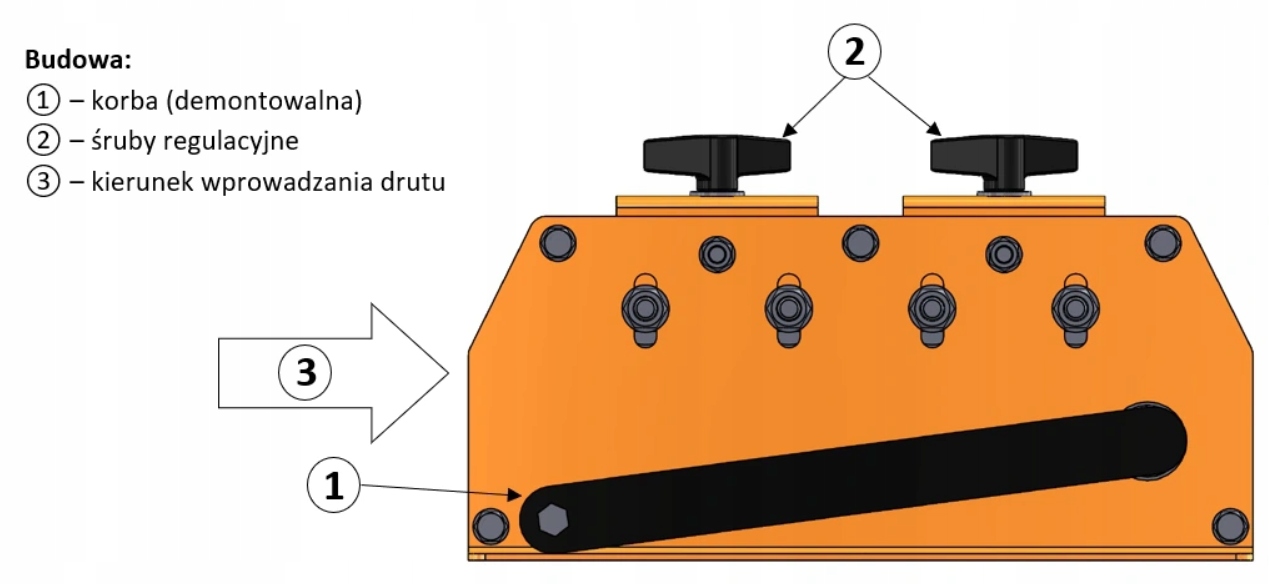 4) Осторожно затягивайте регулировочные винты (2) до тех пор, пока проволоку можно будет перемещать с помощью рукоятки, а проволока, выходящая из выпрямителя, не станет прямой. .
