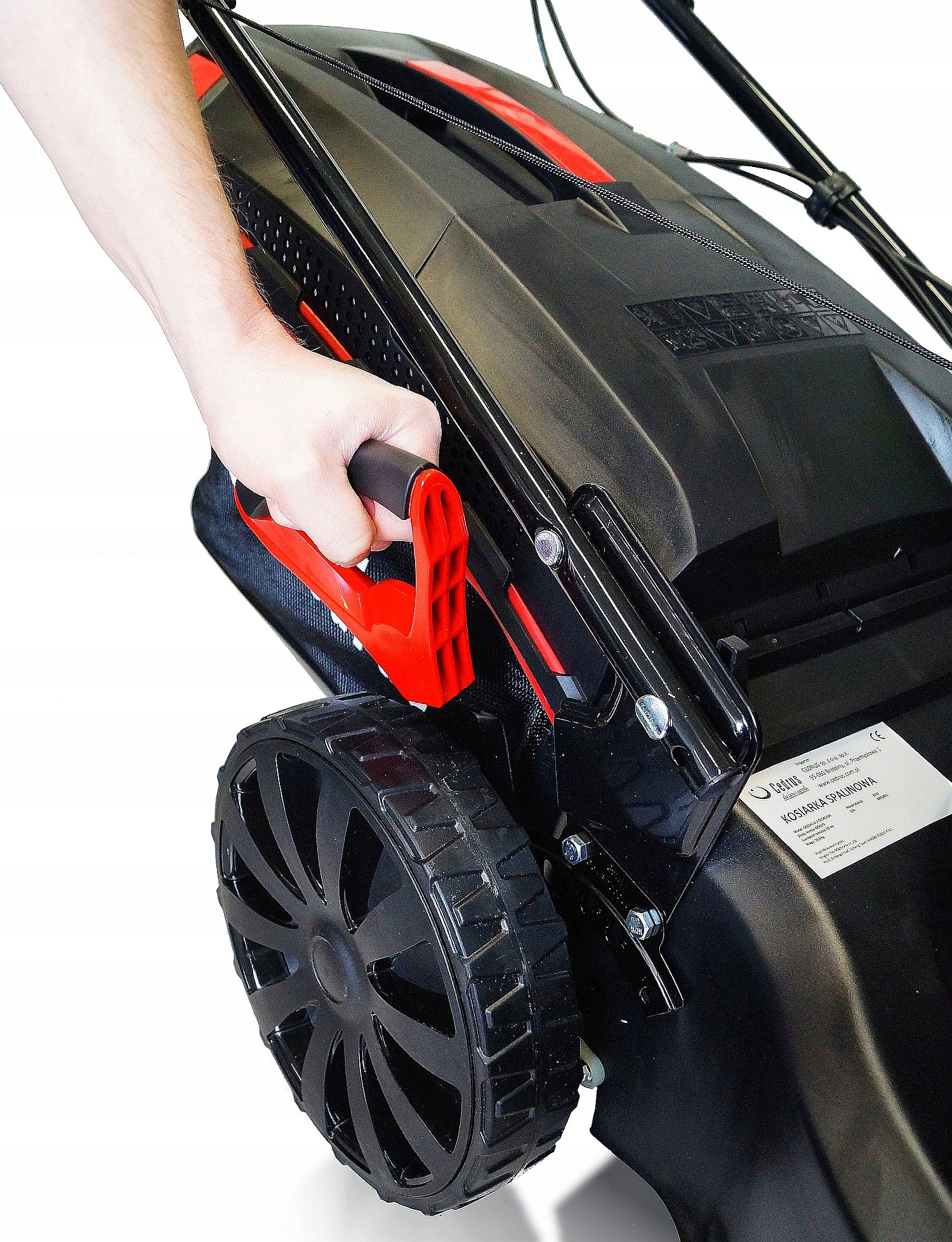 - Большая, колеса с подшипниками позволяют легко маневрировать газонокосилкой