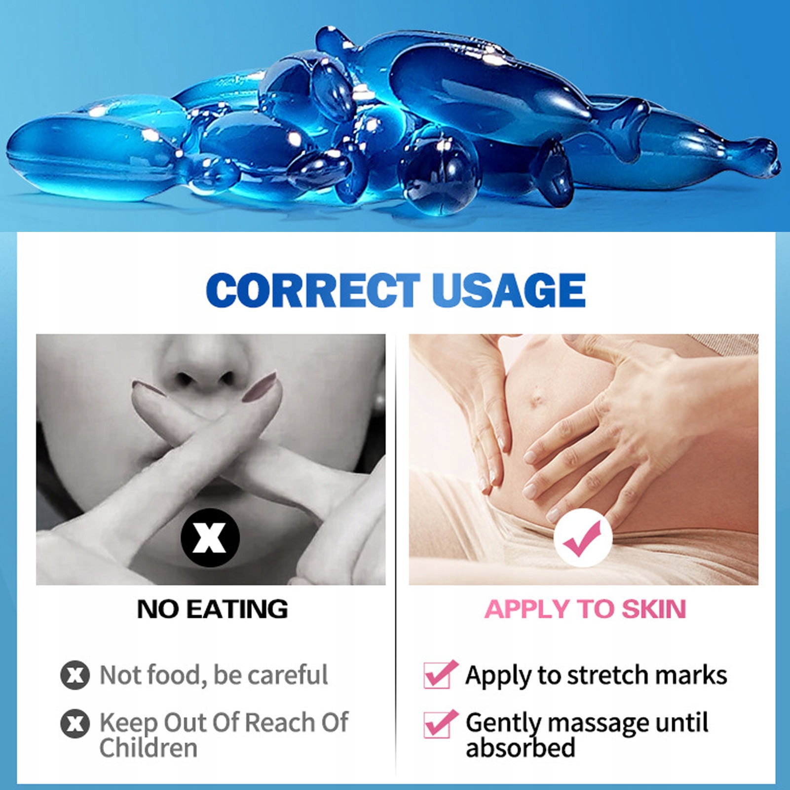 4. Применение: Масло от растяжек подходит для всех типов кожи, подходит для устранения растяжек, шрамов на коже, подходит для дома, путешествий и т. д.