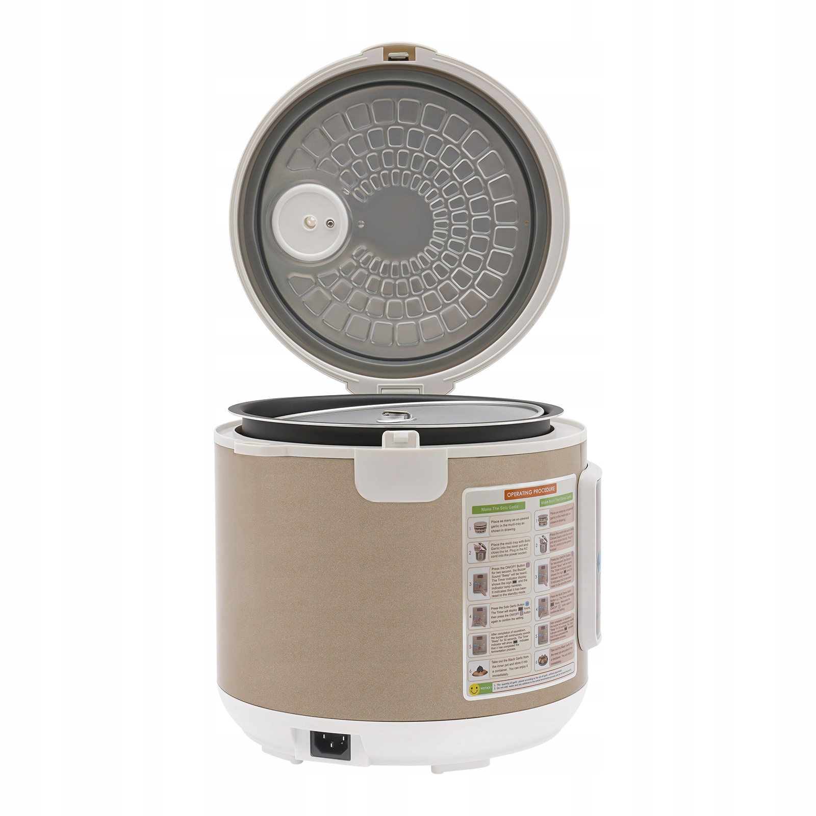 - 4. Обратите внимание, что во время приготовления в воздухе будет легкий запах чеснока, поэтому храните его в сухом и проветриваемом месте. Обратите внимание, что мытье водой или добавление небольшого количества моющего средства устранит запахи. Если что-то прилипло к чесночной полке или внутренней кастрюле, замочите их в горячей воде с уксусом на 10 минут.