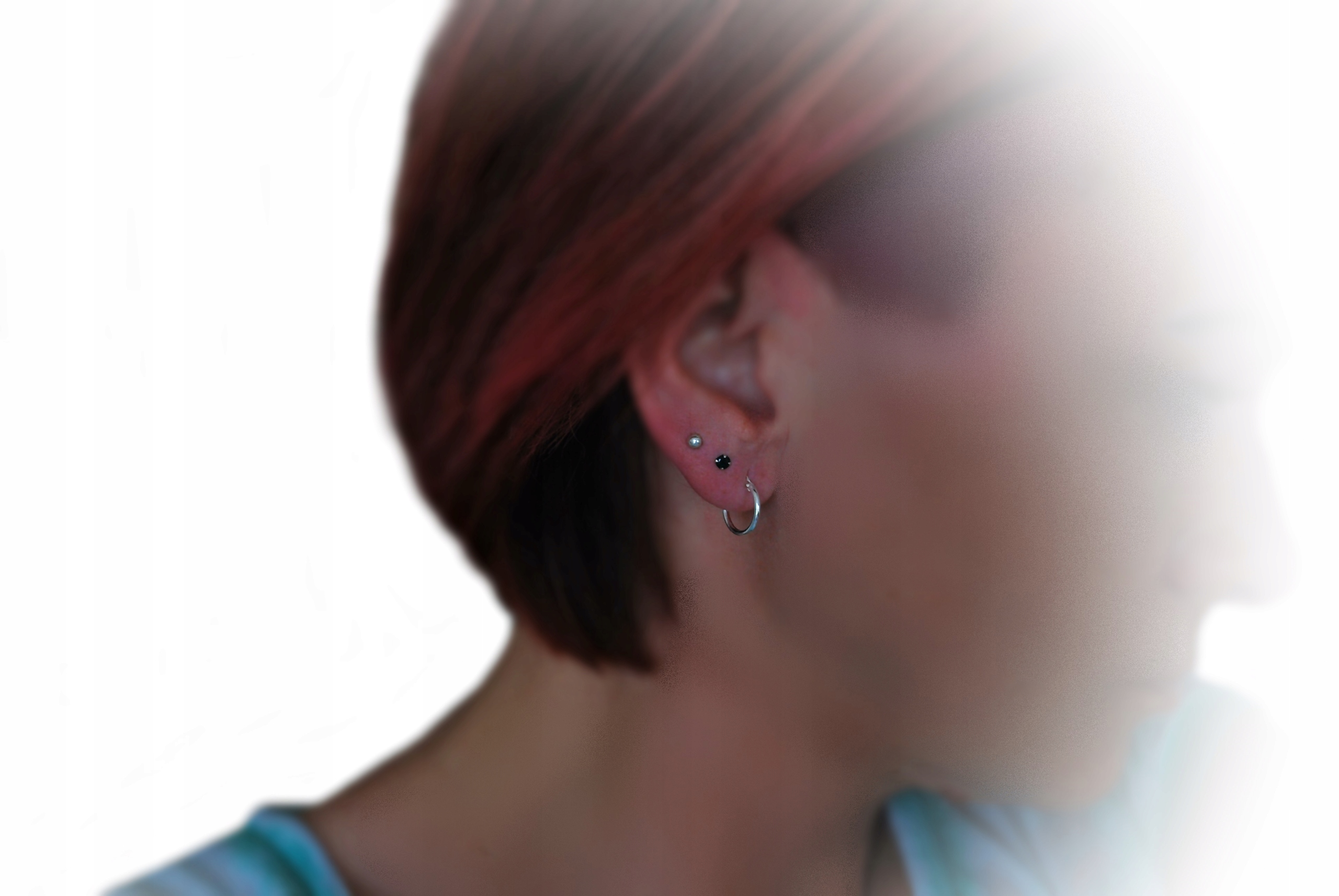 Пирсинг соответствует различным ухам к уху: Tragus, Helix, Forwer Helix