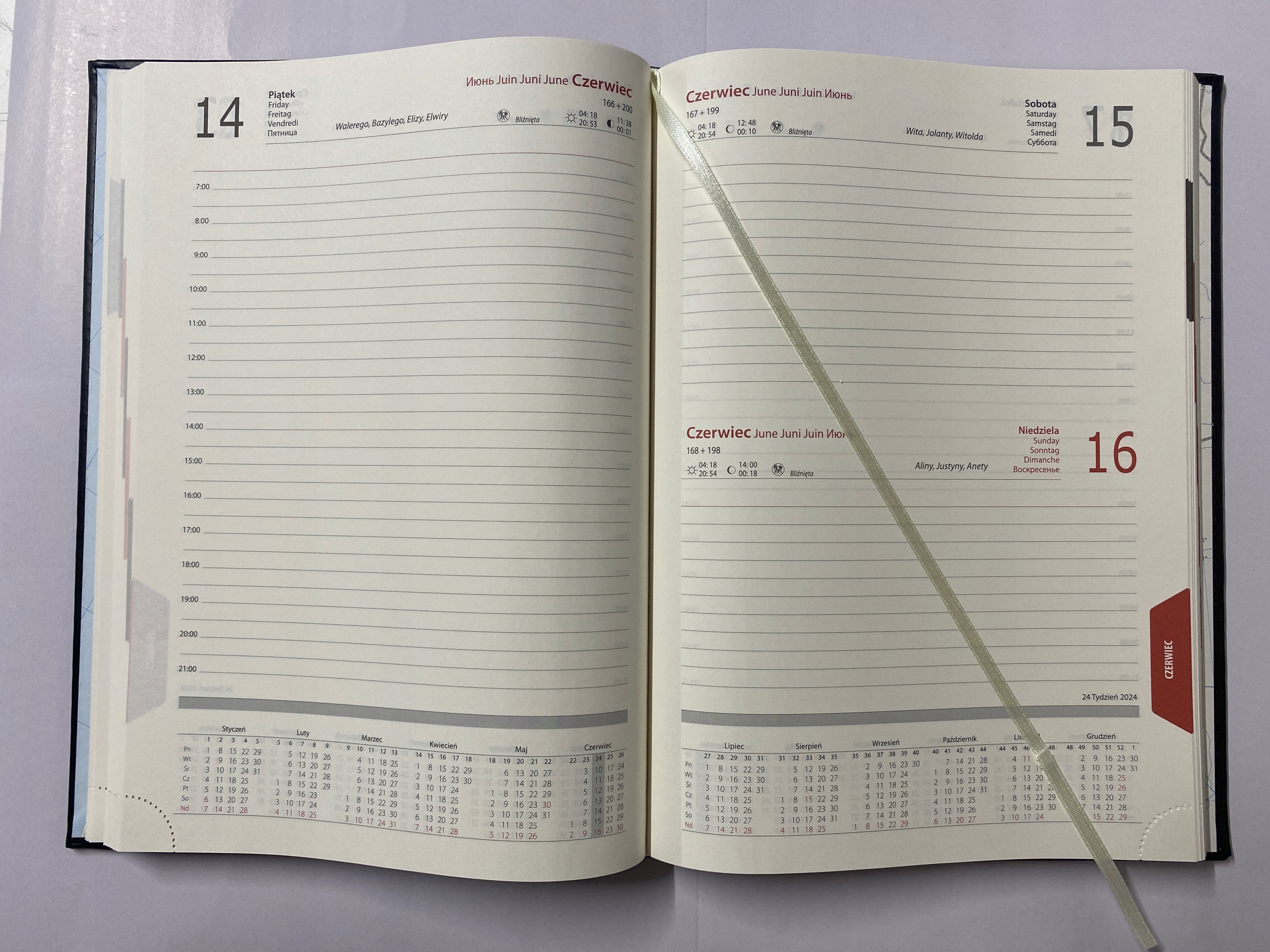 - Календарь: 5. языки (PL, EN, DE, RUS, FR), именины и праздники, фазы луны, восходы и закаты, внизу календаря план всего года